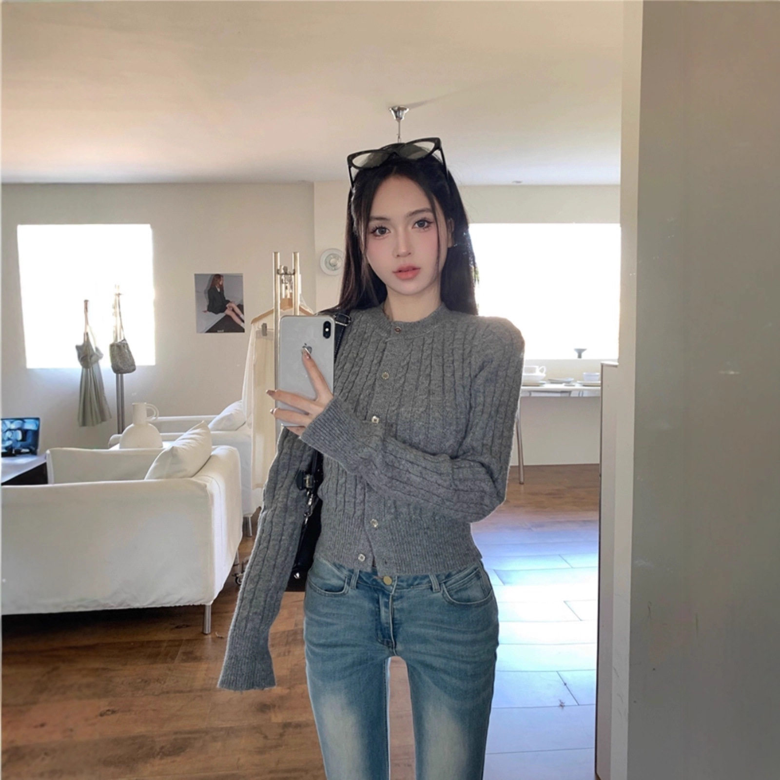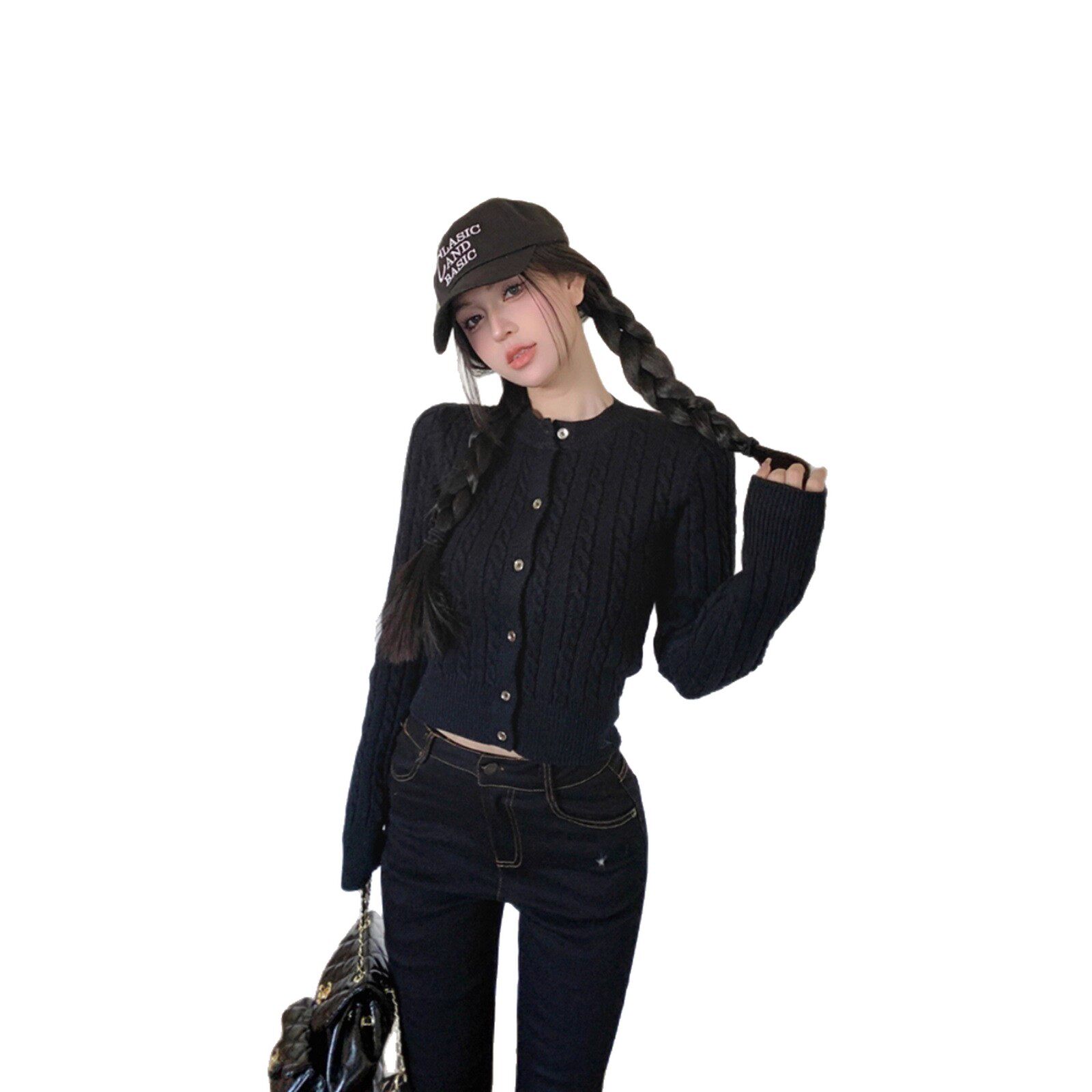 Poragomla黑色麻花毛衣开衫女款新款秋冬冬内搭修身短款打底针织