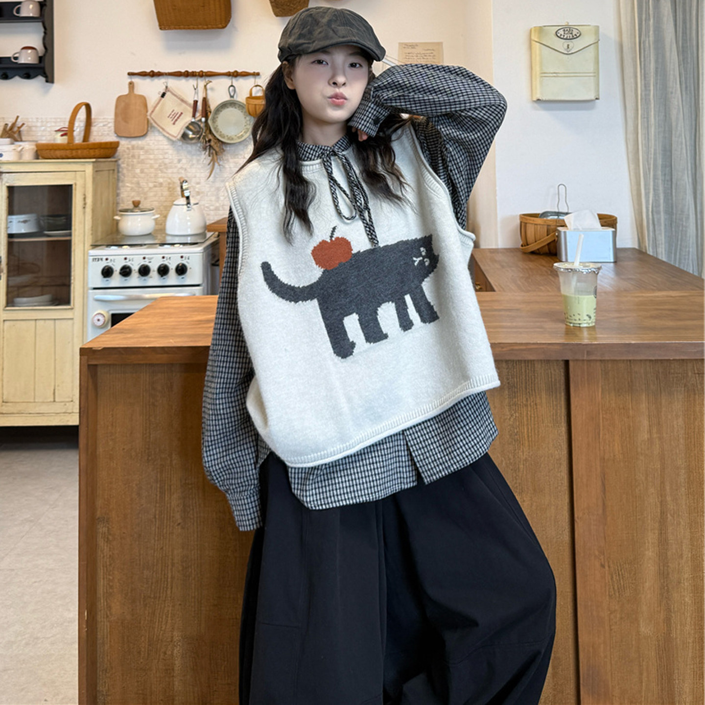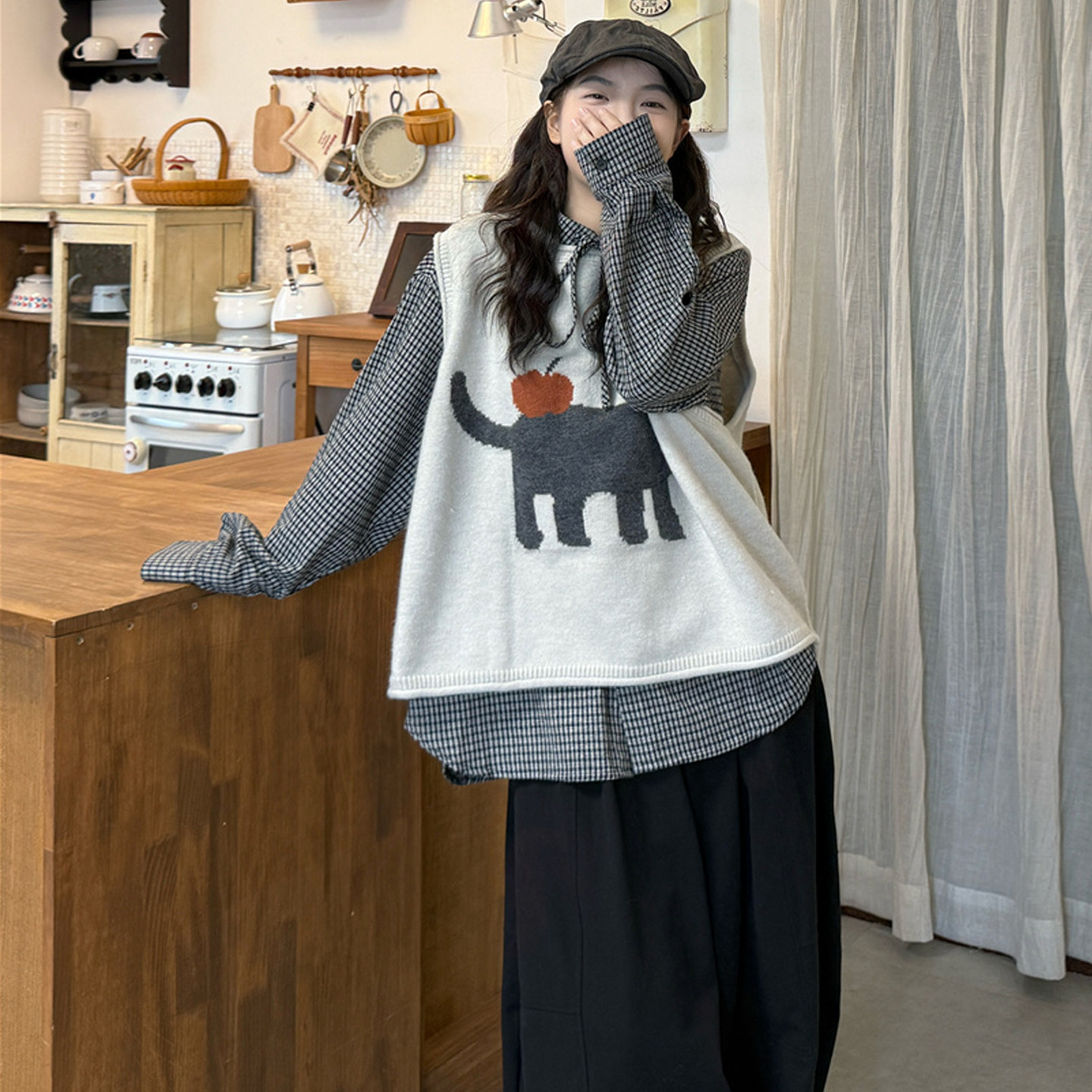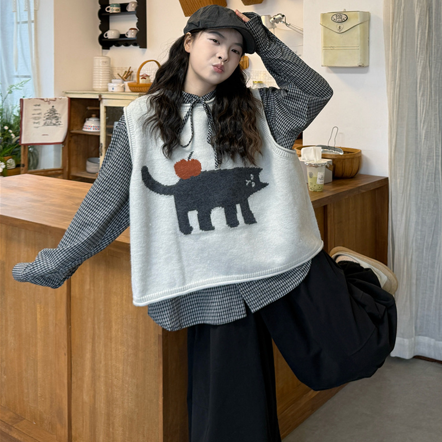 大码女装2026春季新款胖mm格子系带衬衫+毛衣马甲+休闲裤显瘦套装
