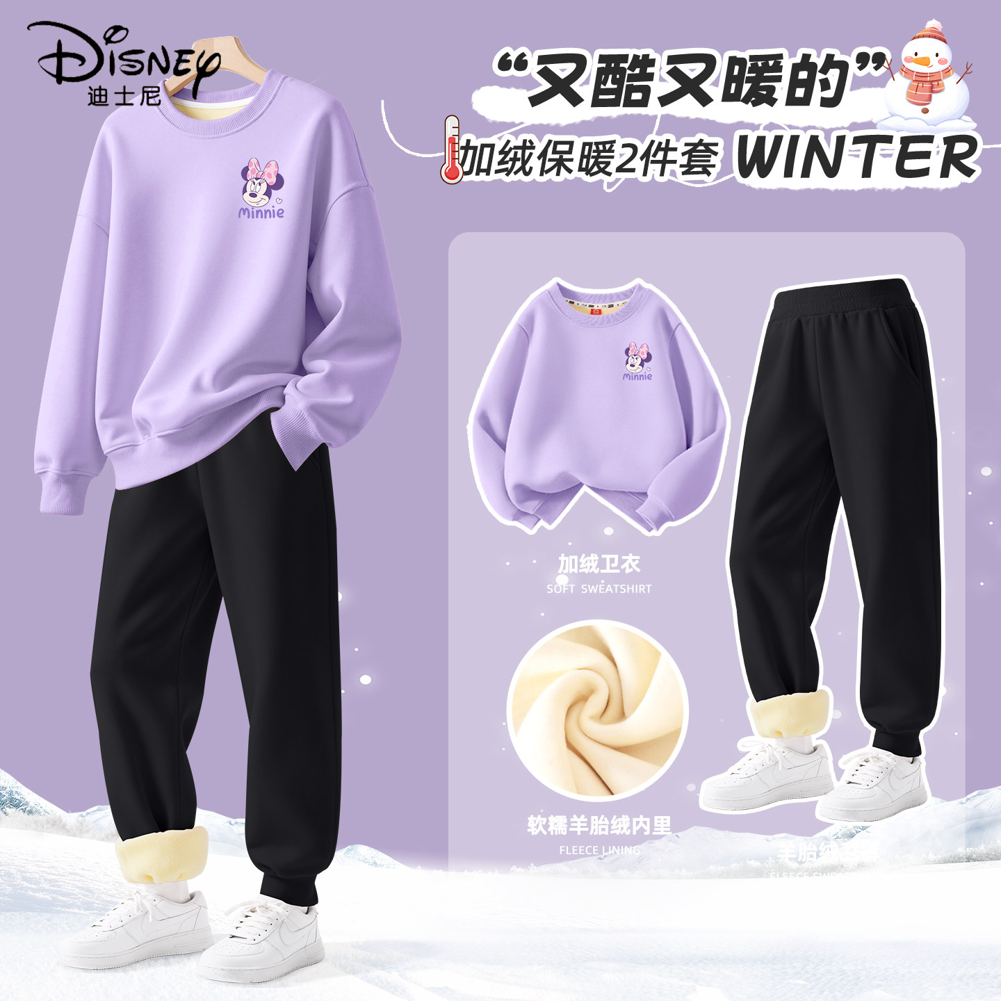 迪士尼女童加绒套装2025新款女孩紫色洋气时髦羊胎绒卫衣儿童冬装