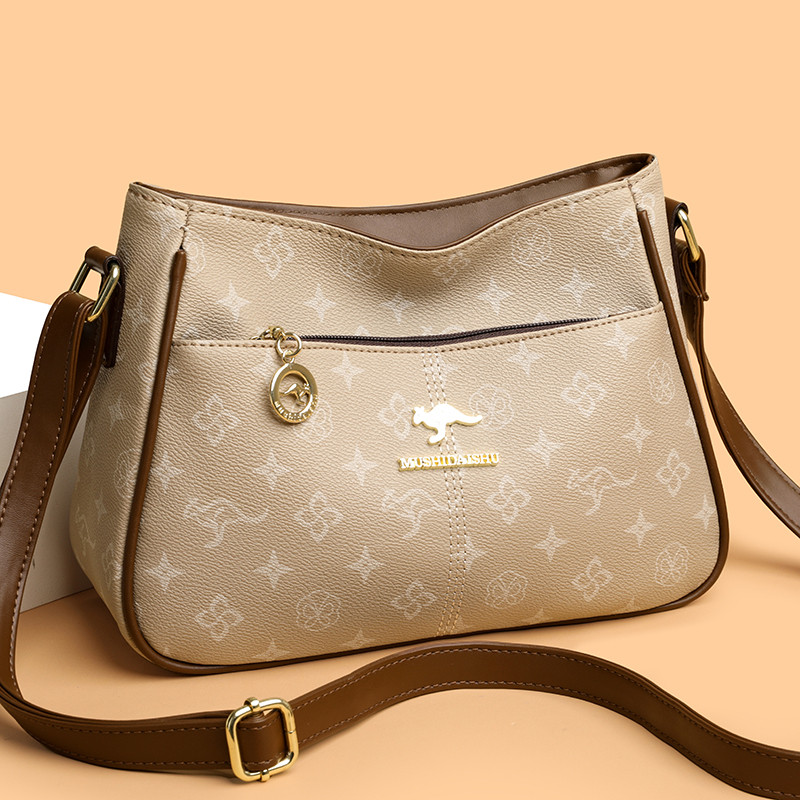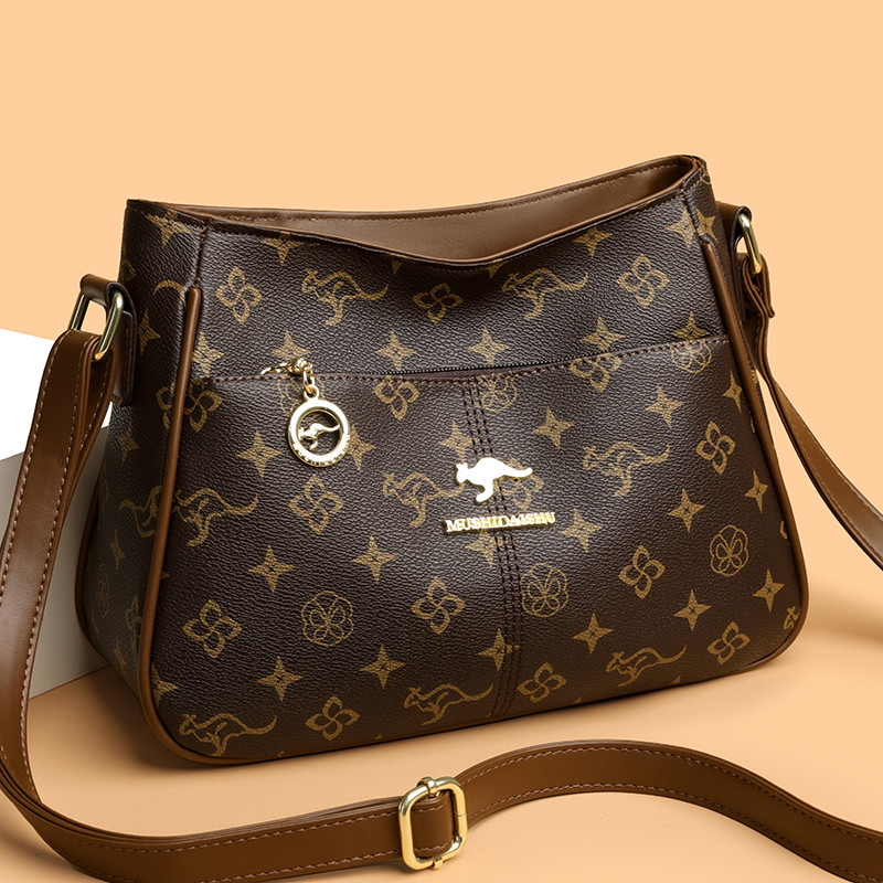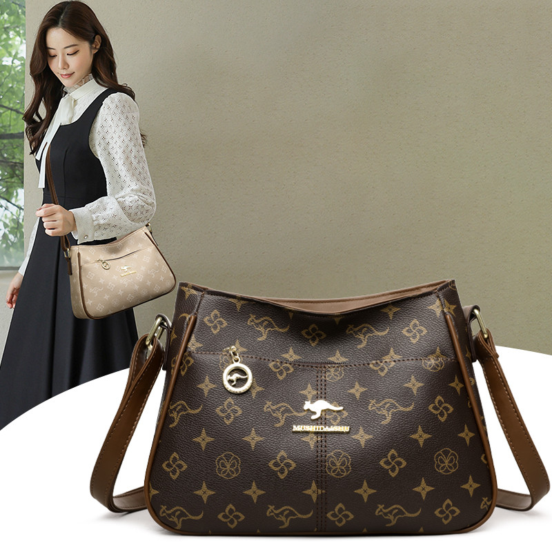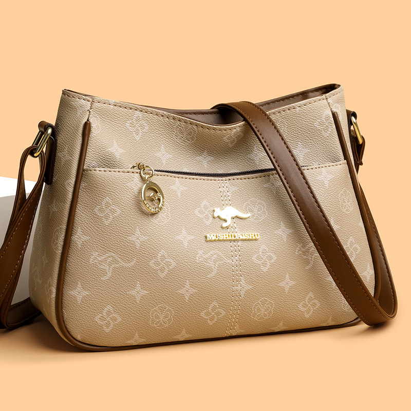 真皮女式包包2026新款高端宽肩带单肩斜挎包大容量印花中年妈妈包