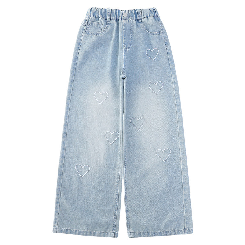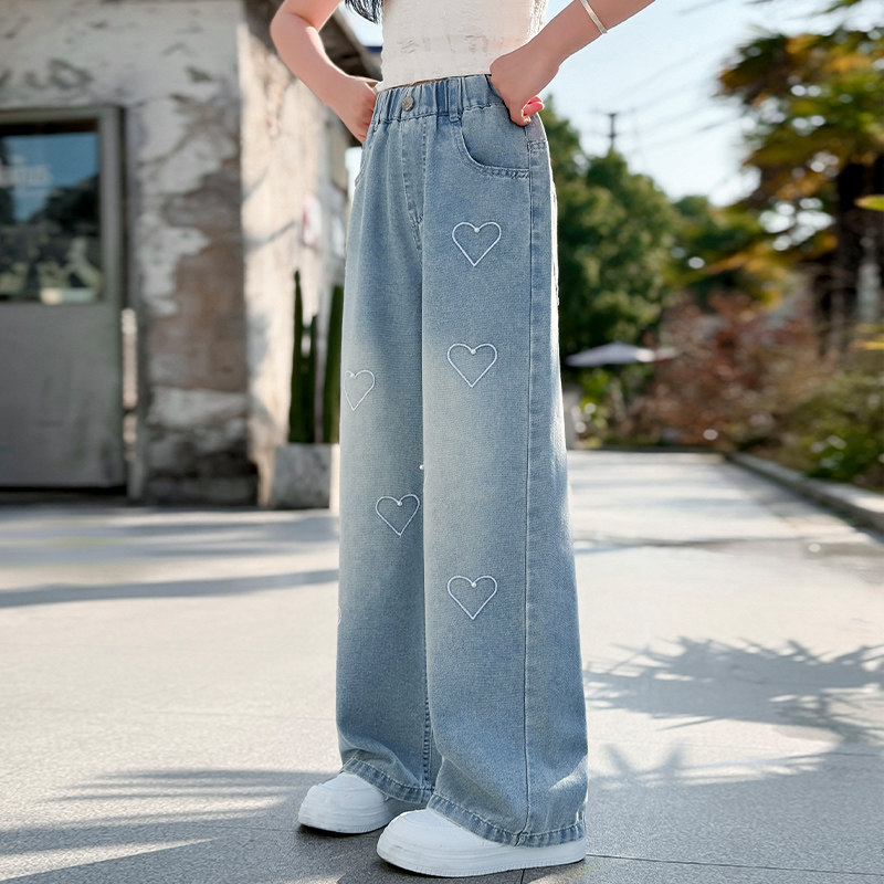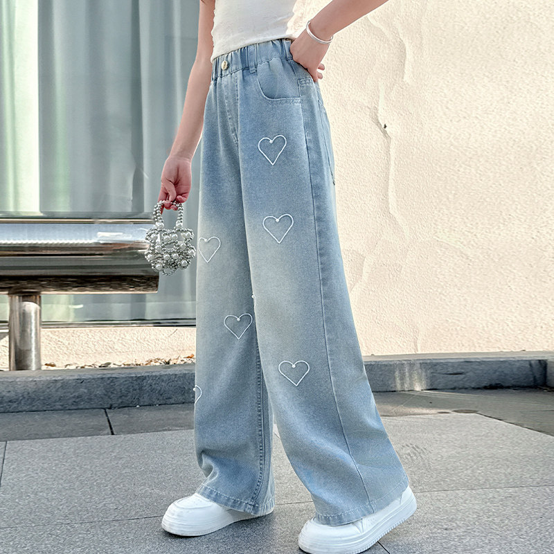 女童牛仔裤2025新款春夏装女孩洋气爱心钉珠直筒阔腿儿童裤子夏季