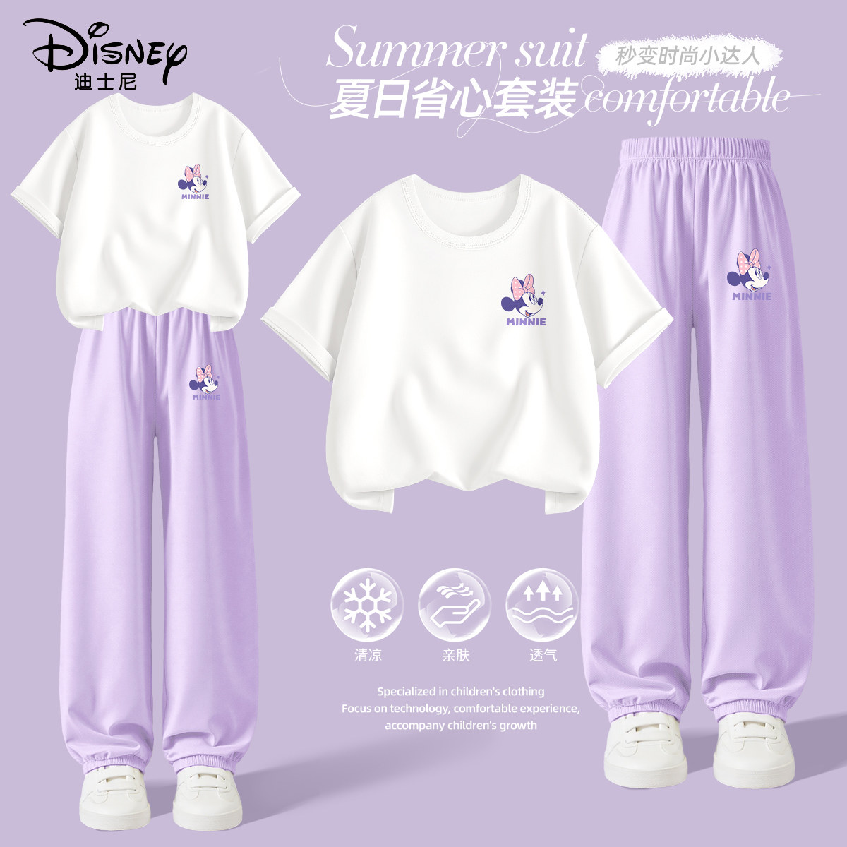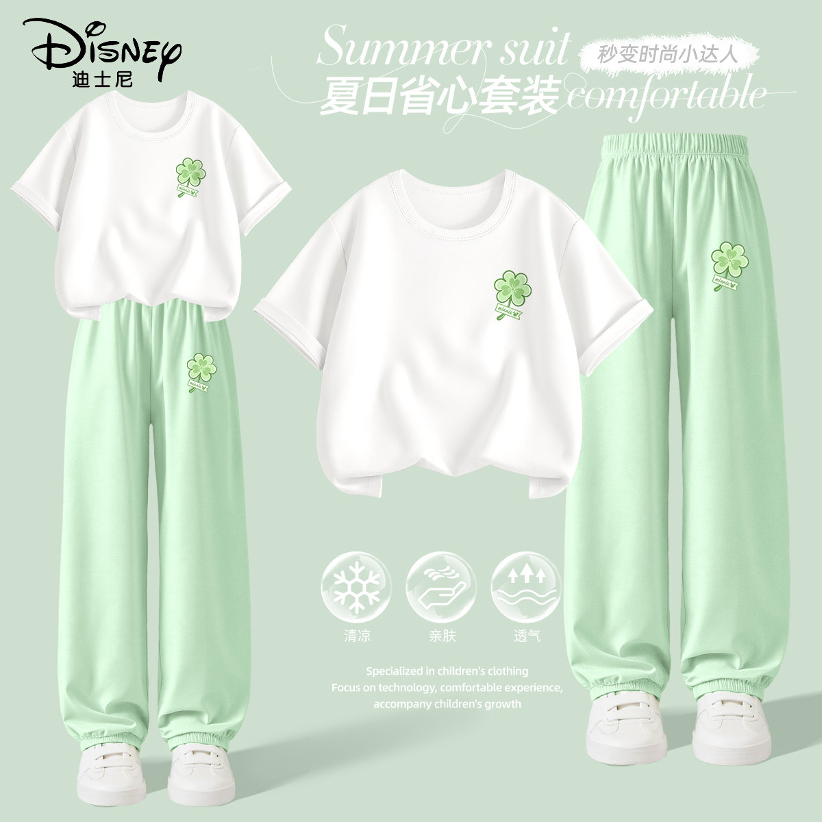 迪士尼女童夏季套装2026新款纯棉短袖女孩冰丝防蚊裤儿童夏装衣服