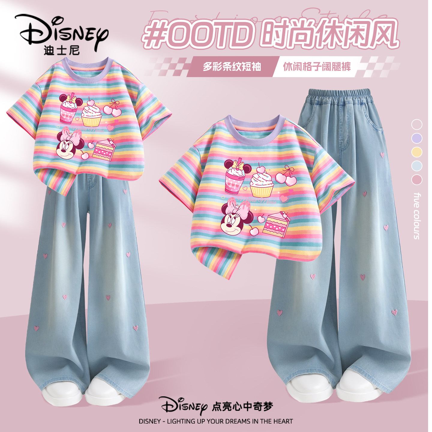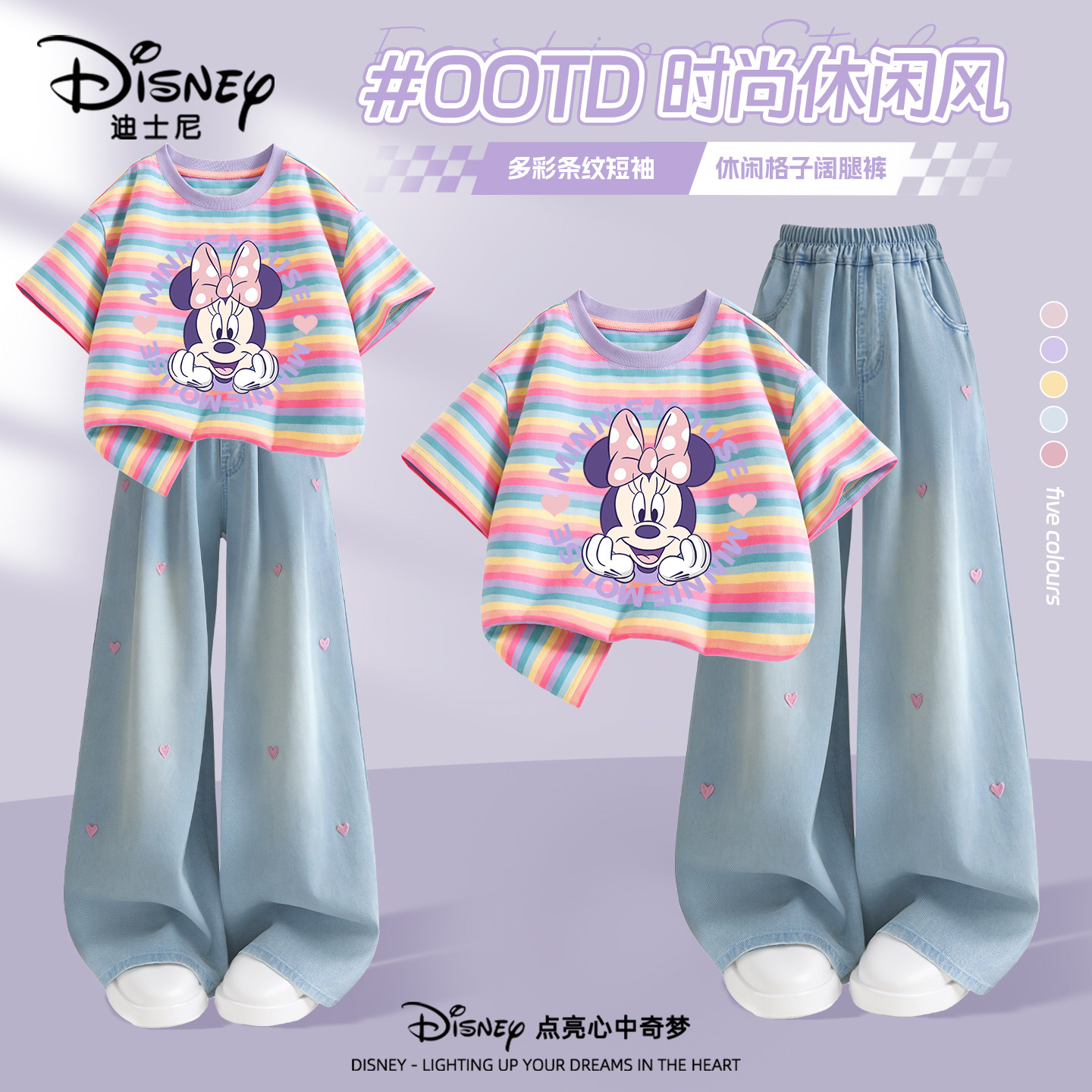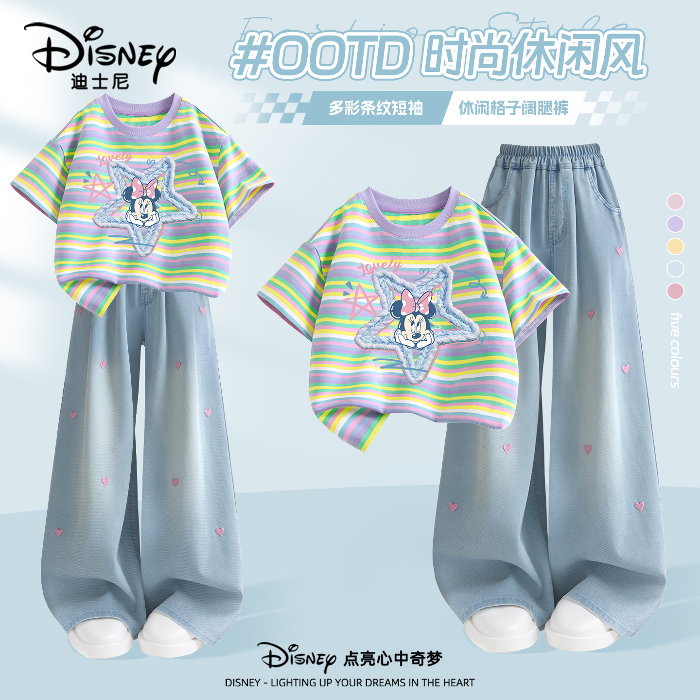迪士尼女童夏装套装2026新款夏季薄款条纹短袖女孩童装儿童牛仔裤