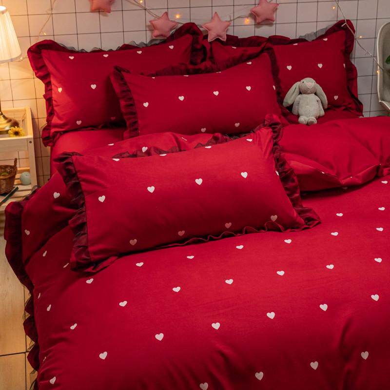 公主风纯棉床上用品四件套新婚庆少女心大红色磨毛被套结婚床单