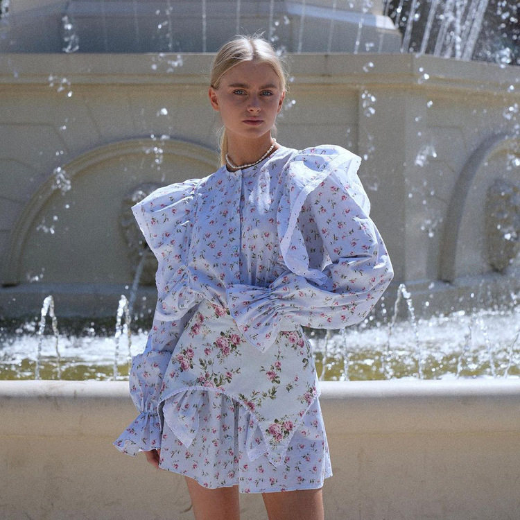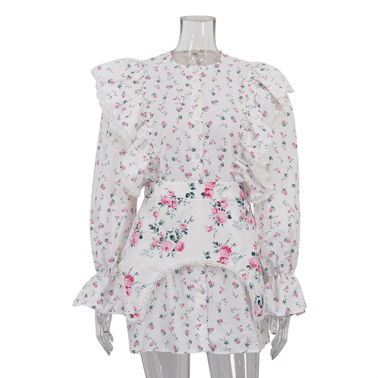Women Dresses Floral Print设计感可拆卸腰封碎花长袖短款连衣裙