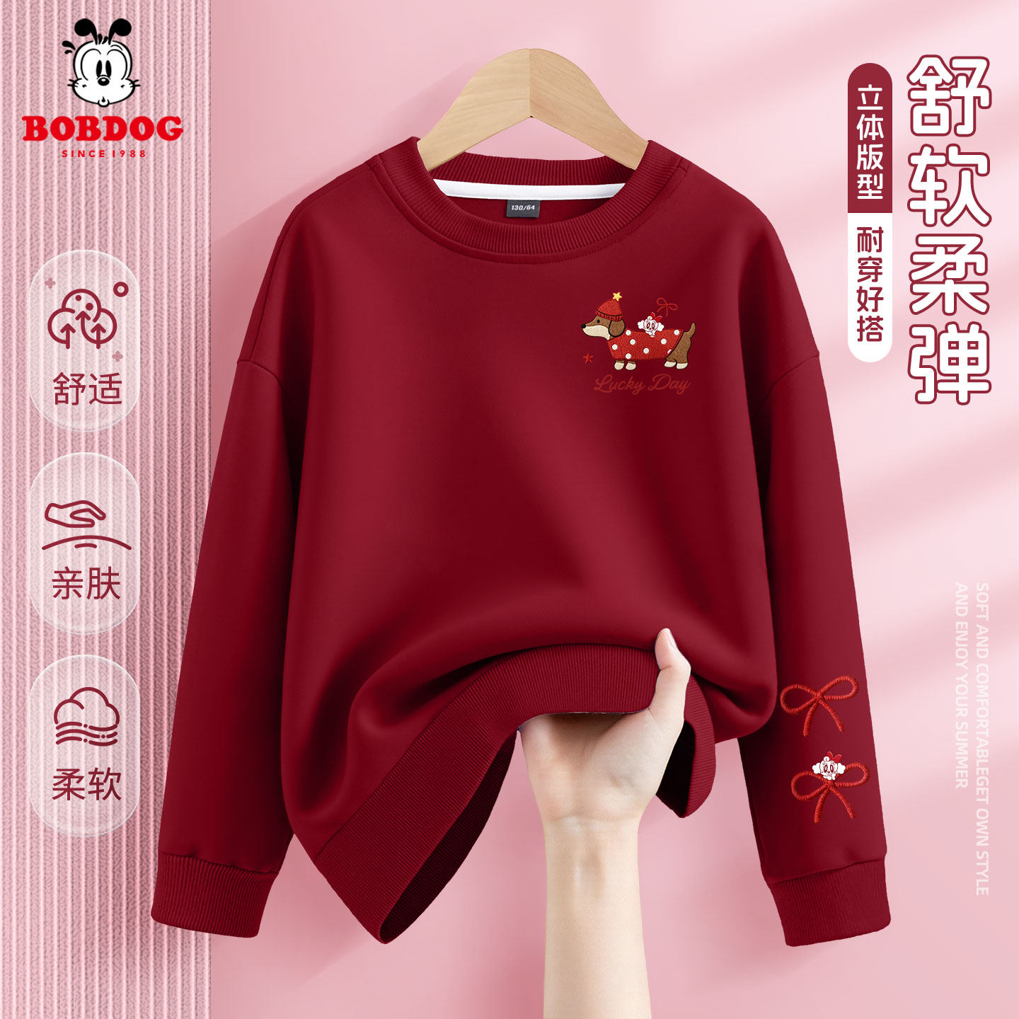 巴布豆女童春秋款卫衣2026新款儿童红色上衣复古洋气女孩薄款衣服