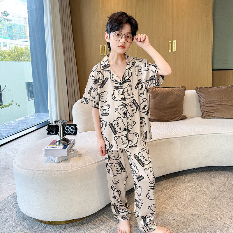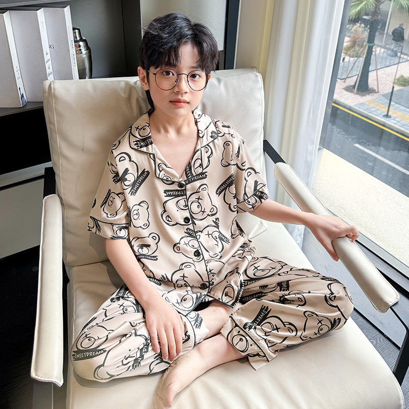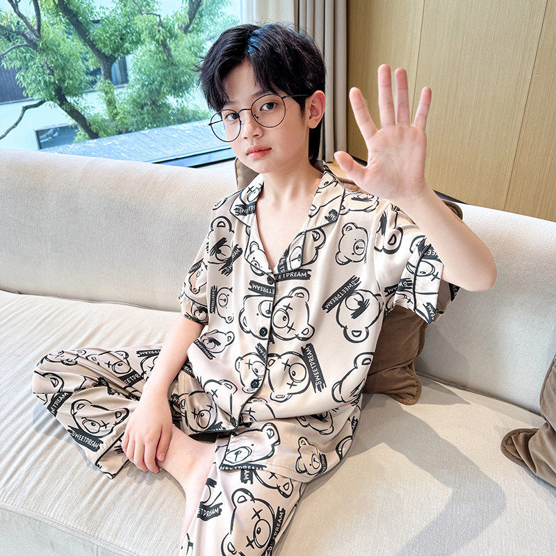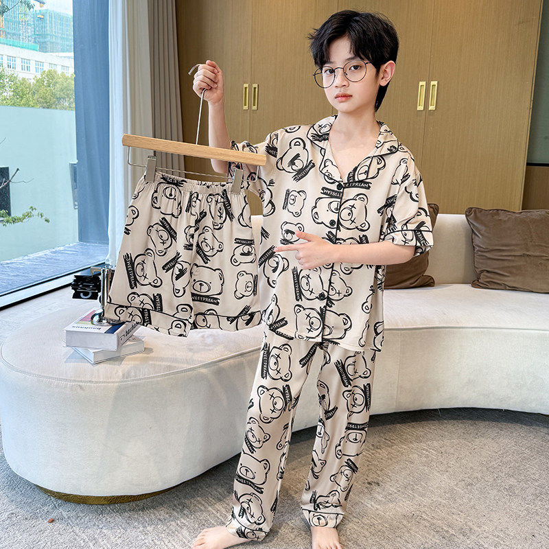 儿童睡衣男童夏季薄款中大童冰丝短袖家居套装男孩空调服三件套