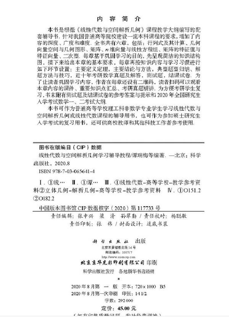 现货线性代数与空间解析几何学习辅导教程 谭瑞梅等 科学出版社9787030656414