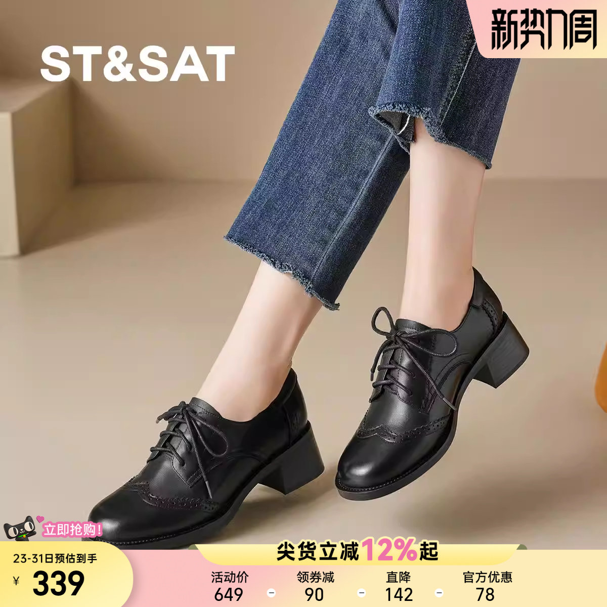 星期六粗跟乐福鞋女新款中跟软底通勤系带小皮鞋女鞋真皮黑色单鞋