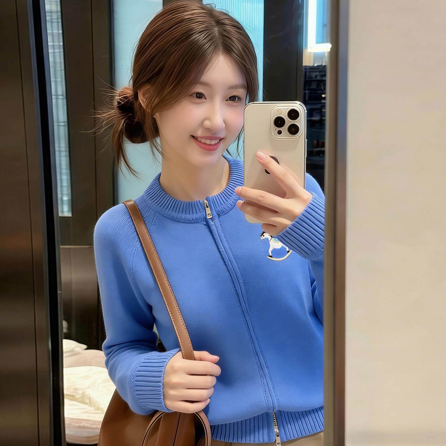 巨好看的双拉链蓝色小马针织开衫毛衣女款2026新款冬季多巴胺穿搭