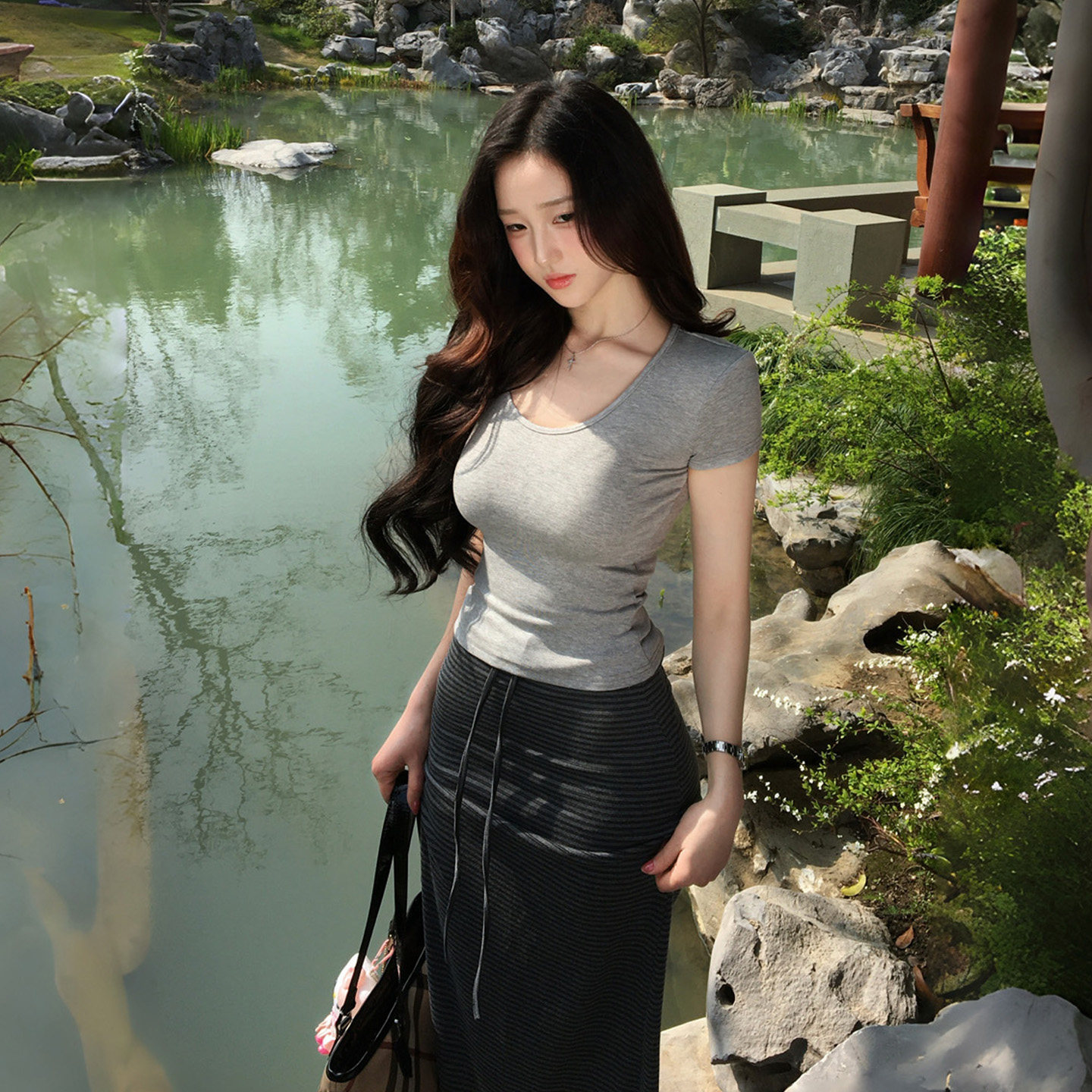 张小涵 韩系正肩U领修身短袖T恤女款夏季显瘦纯色百搭基础款上衣
