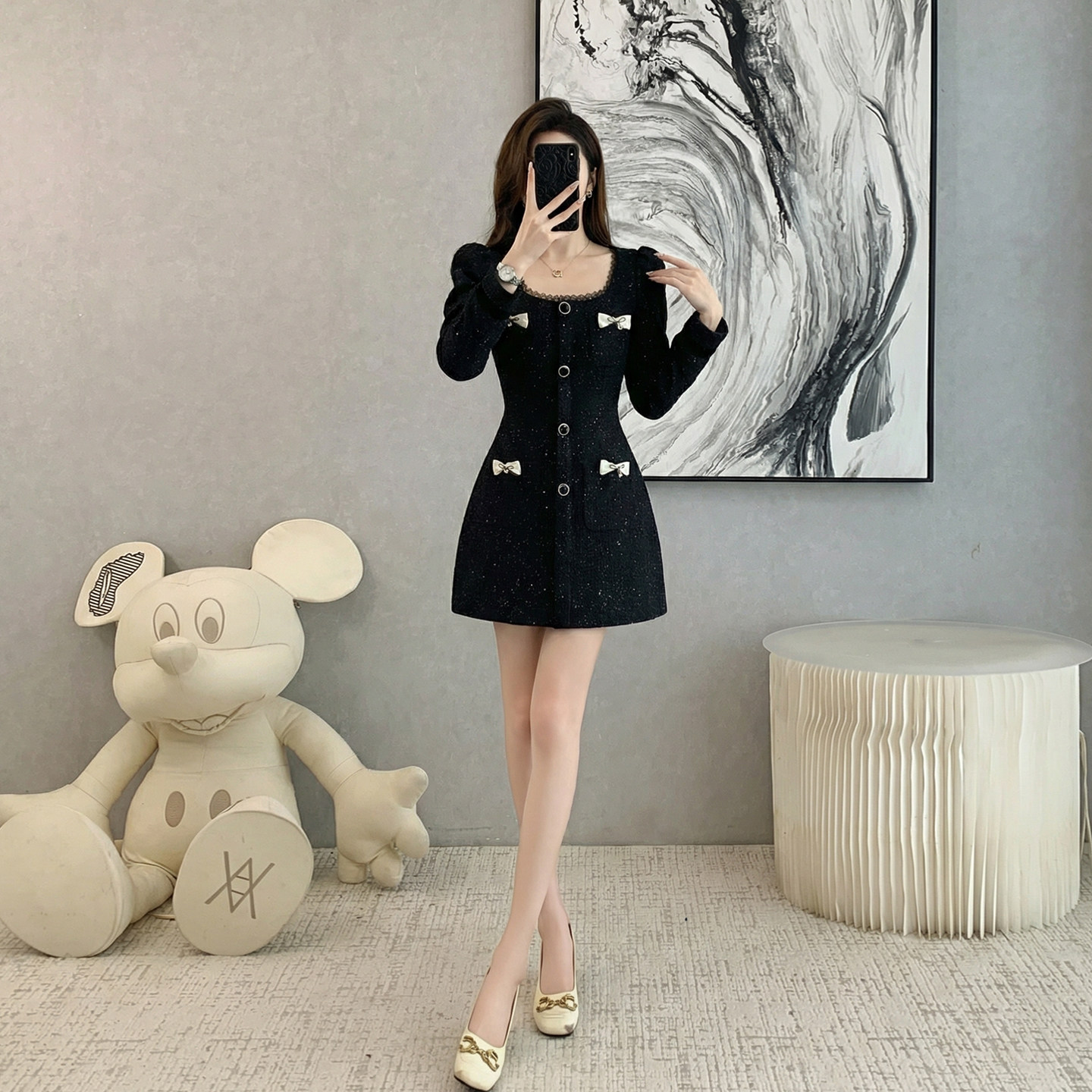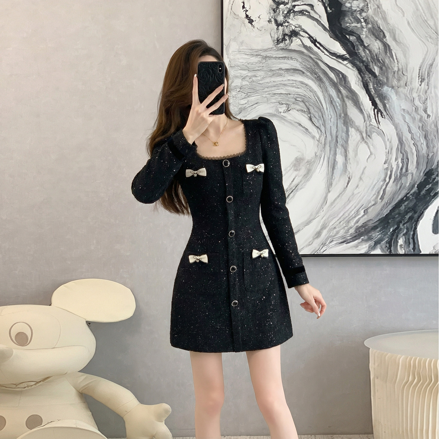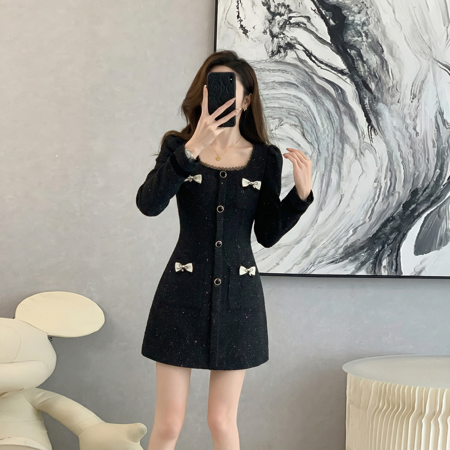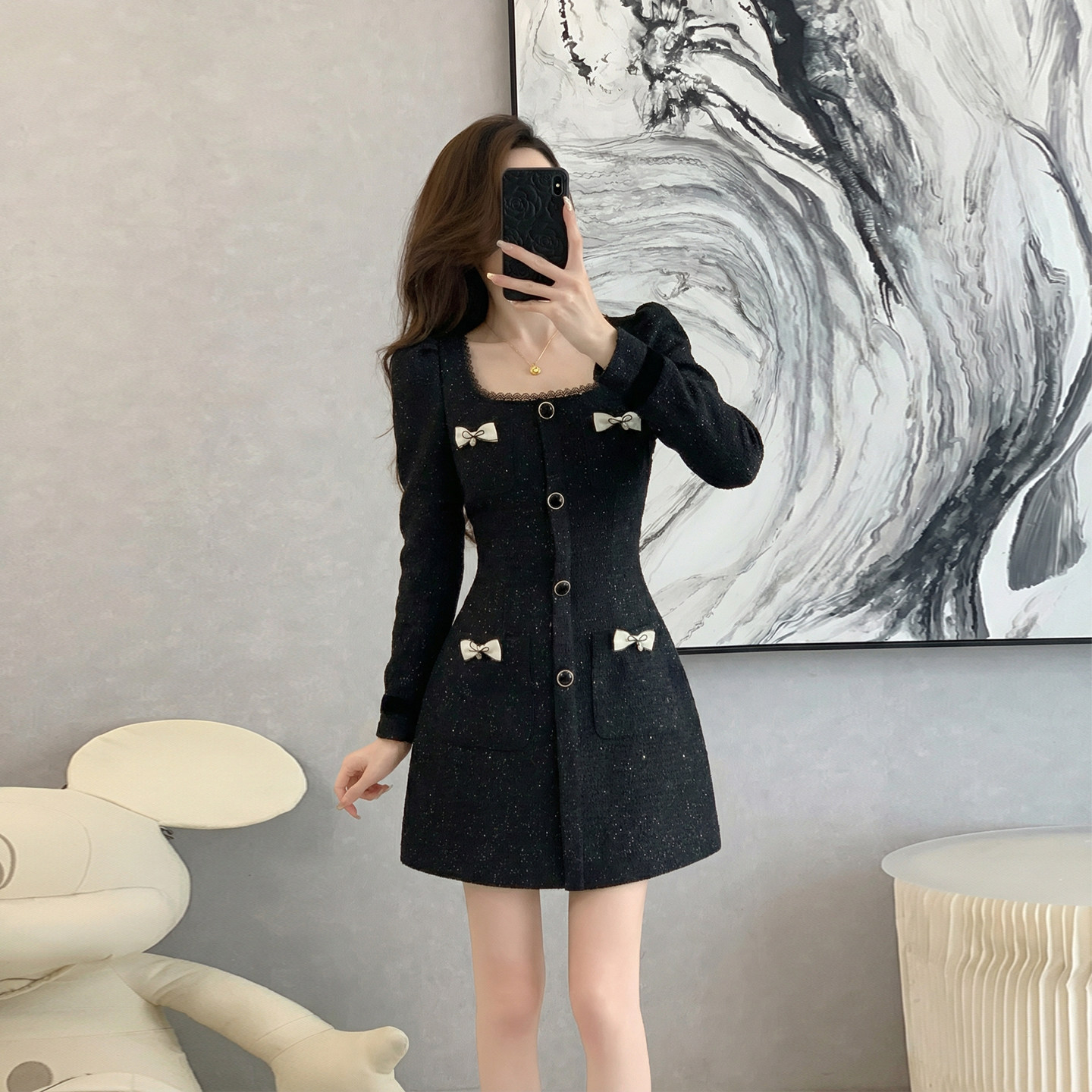 千金风黑色小香风方领连衣裙女秋冬季高级感蝴蝶结装饰短款气质裙
