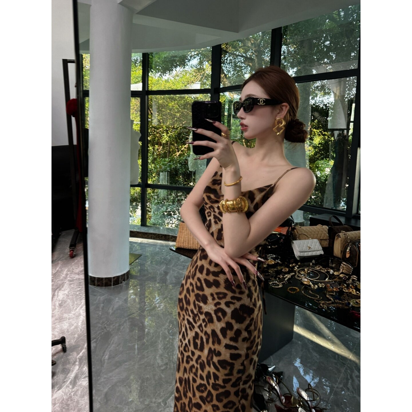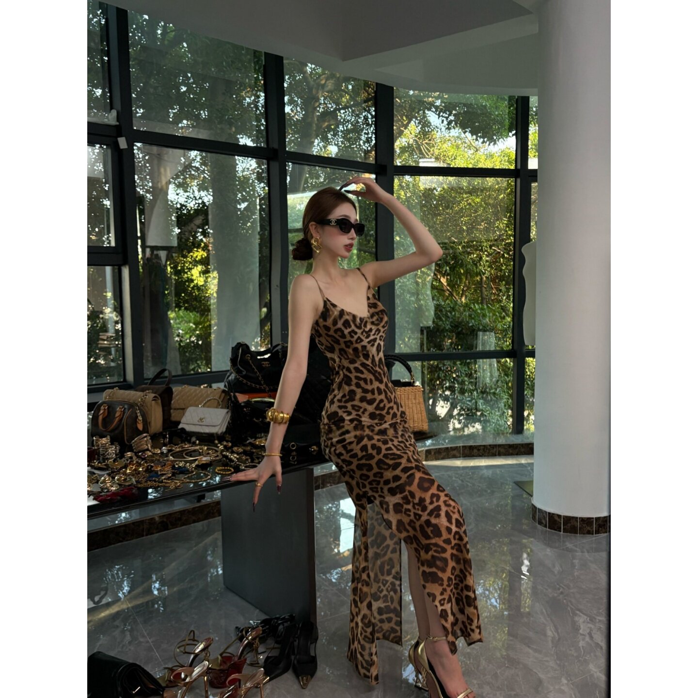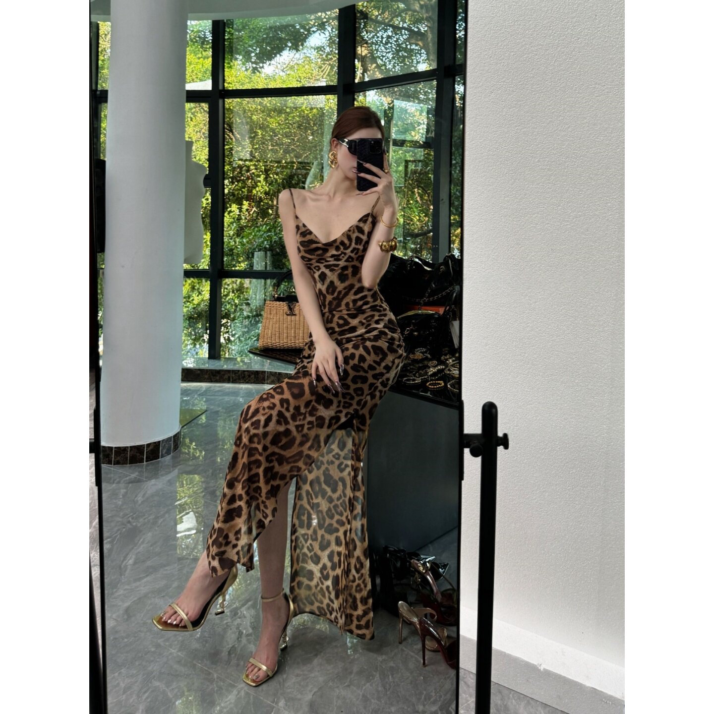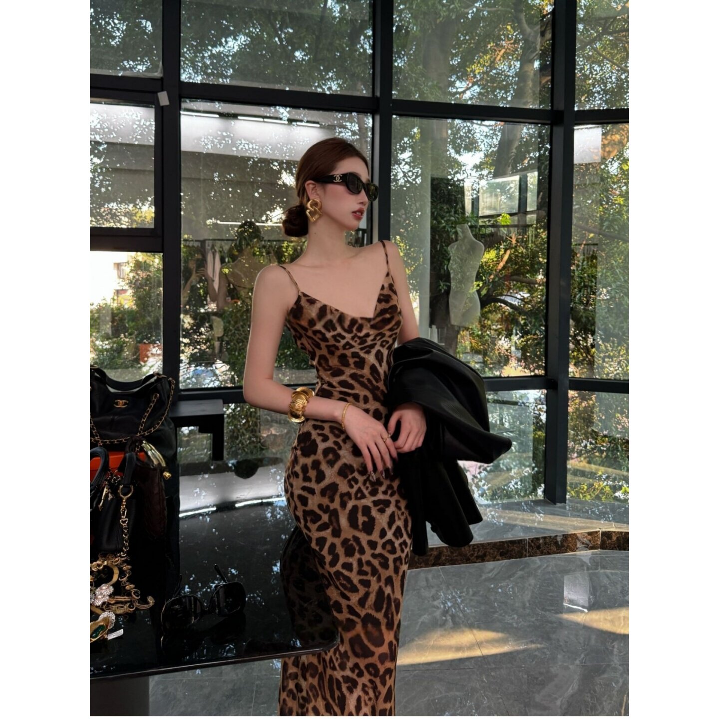 大码胖mm法式气质豹纹吊带连衣裙西装外套女春季露背收腰显瘦套装