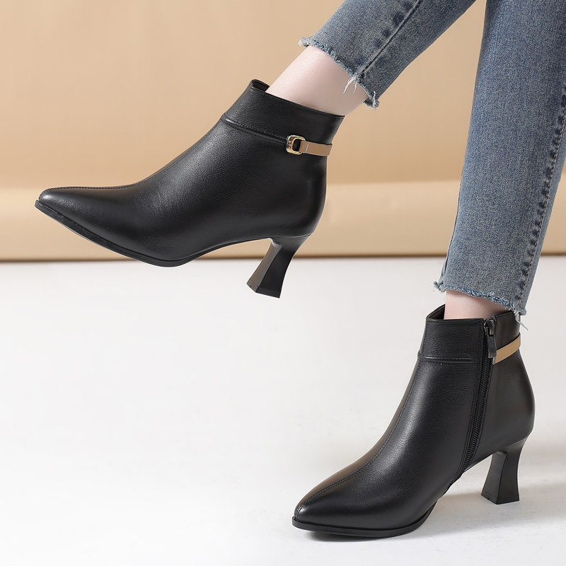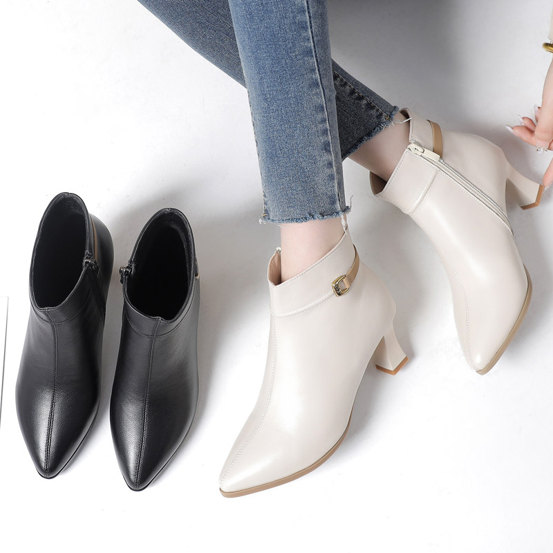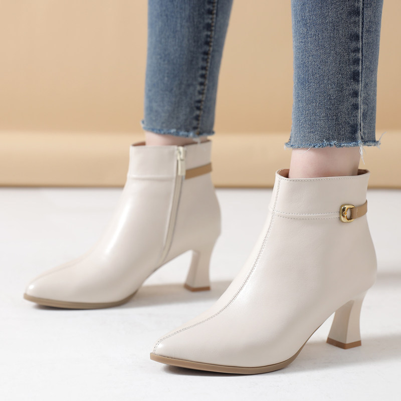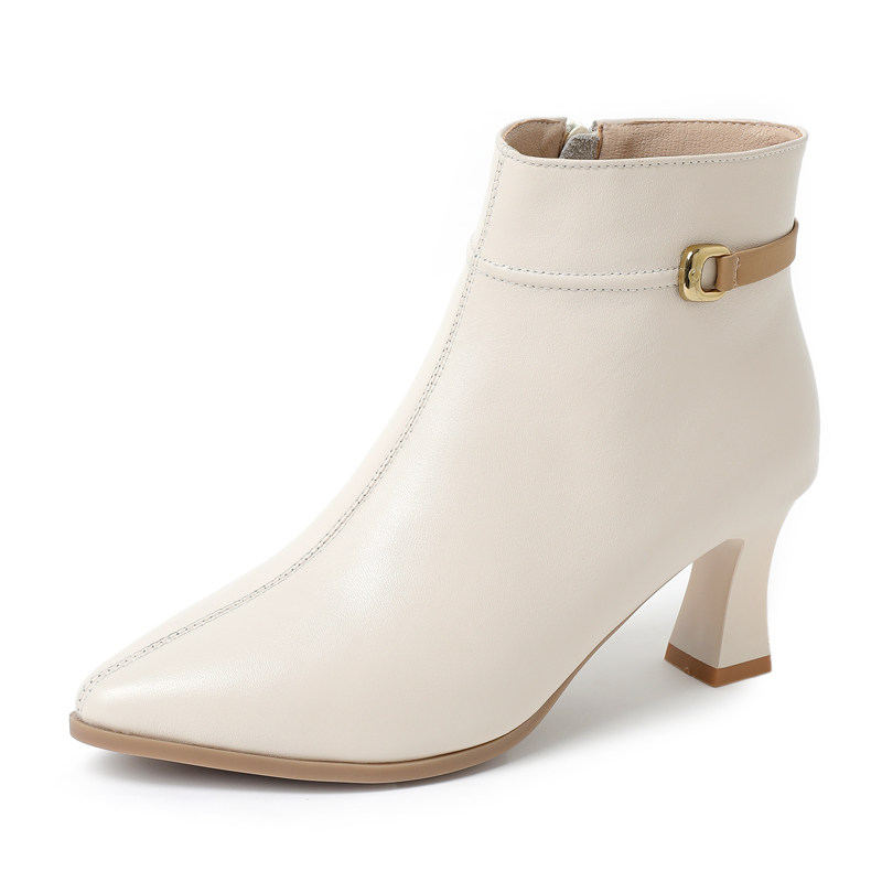 真皮高跟短靴2026新款春秋百搭细跟女靴小码3233尖头软底米色单靴