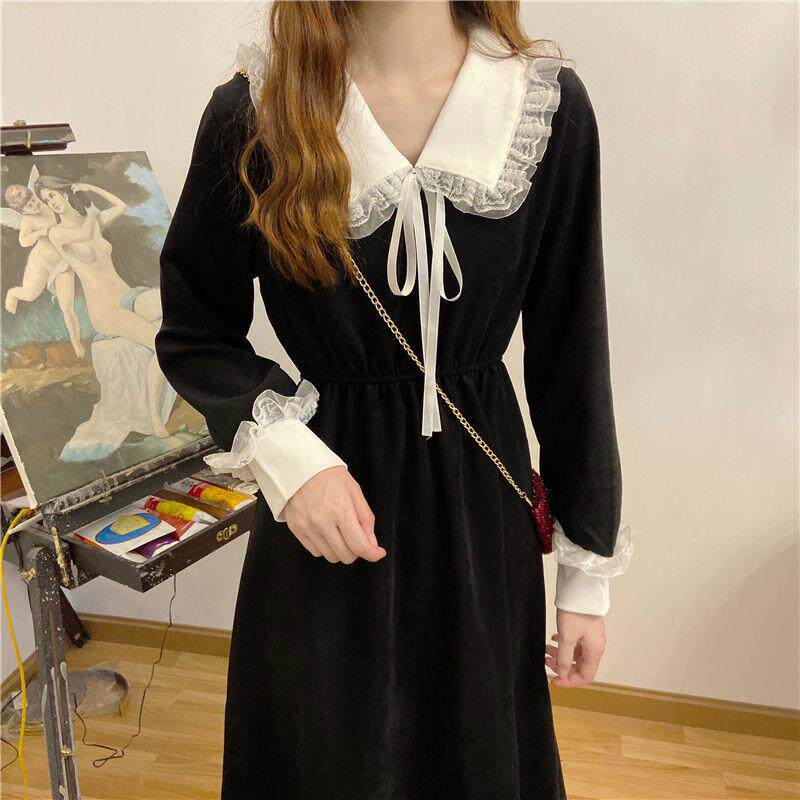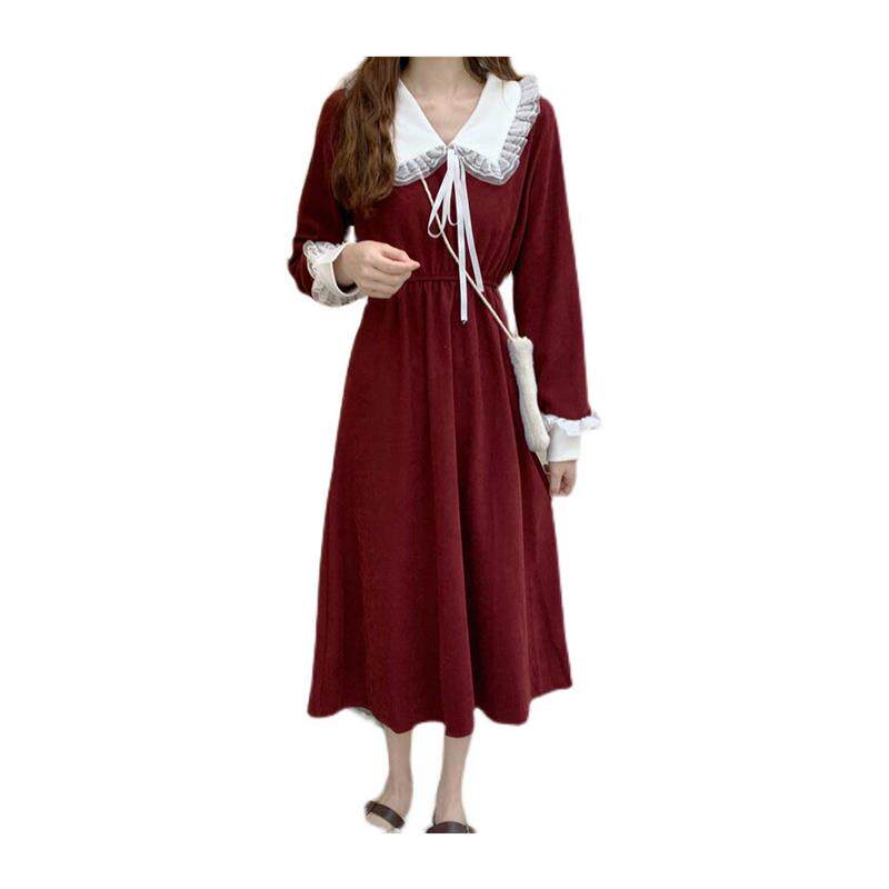 新款圣诞节秋冬季法式裙子女装红色收腰显瘦长袖赫本风连衣裙大码