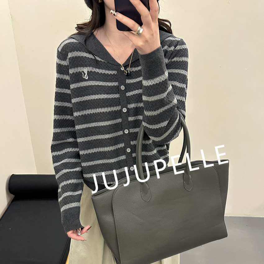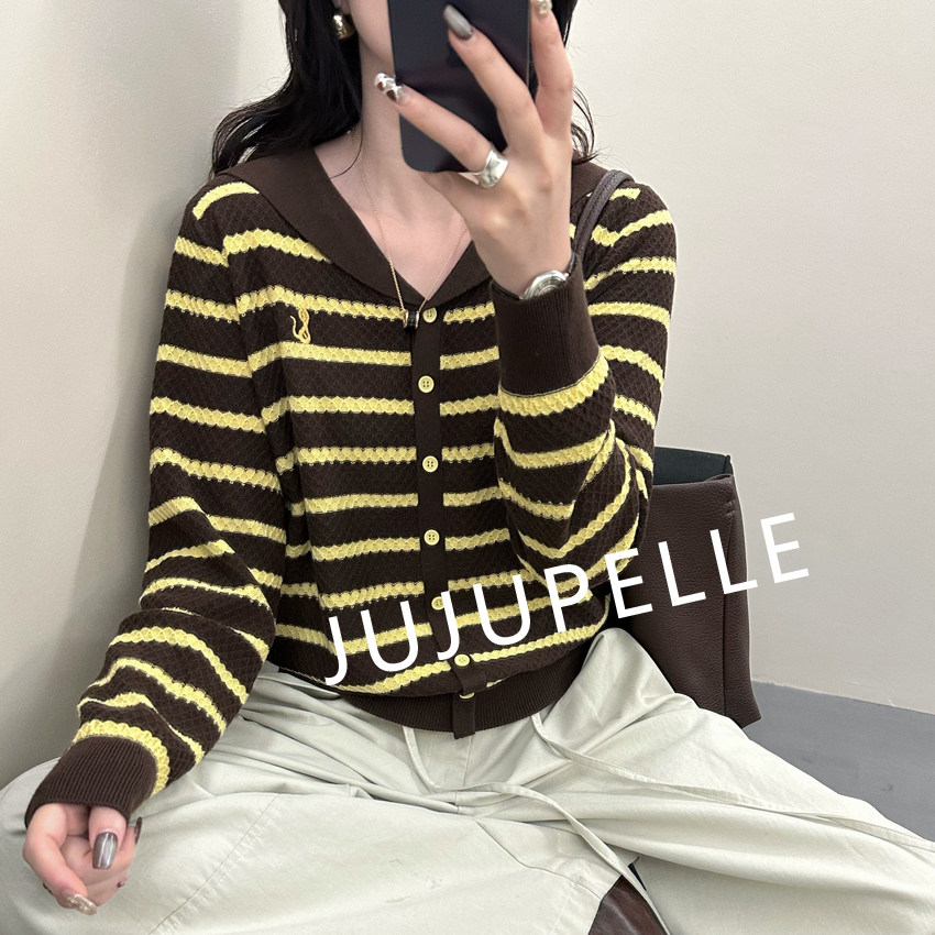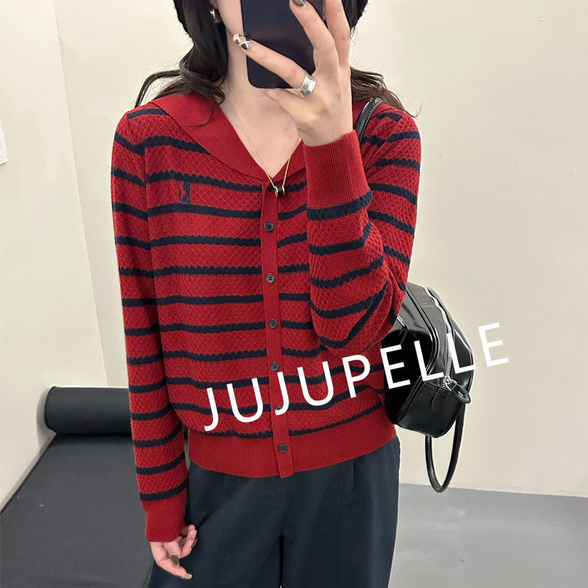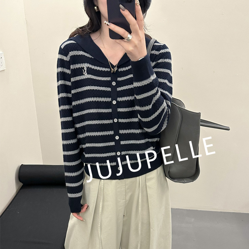 海军领刺绣条纹开衫V领2026早春减龄显瘦针织衫毛衣宽松上衣女款