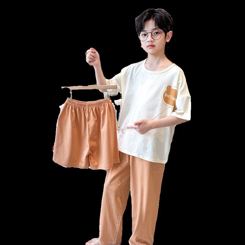纯棉儿童睡衣2024夏季新款男童短袖长裤三件套装男孩青少年家居服