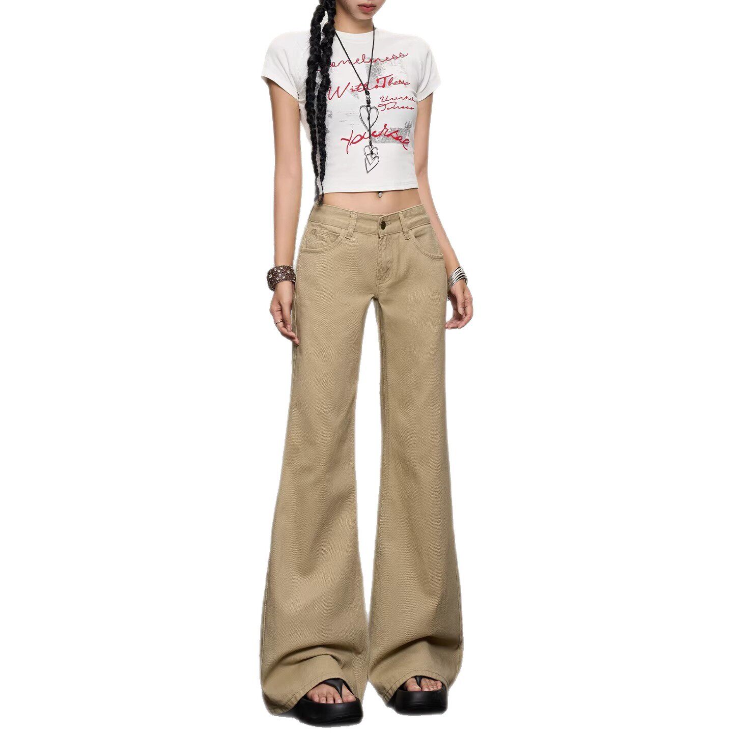 加绒加厚裤子女款冬牛仔裤微喇阔腿牛仔微喇裤女喇叭小个子卡其色
