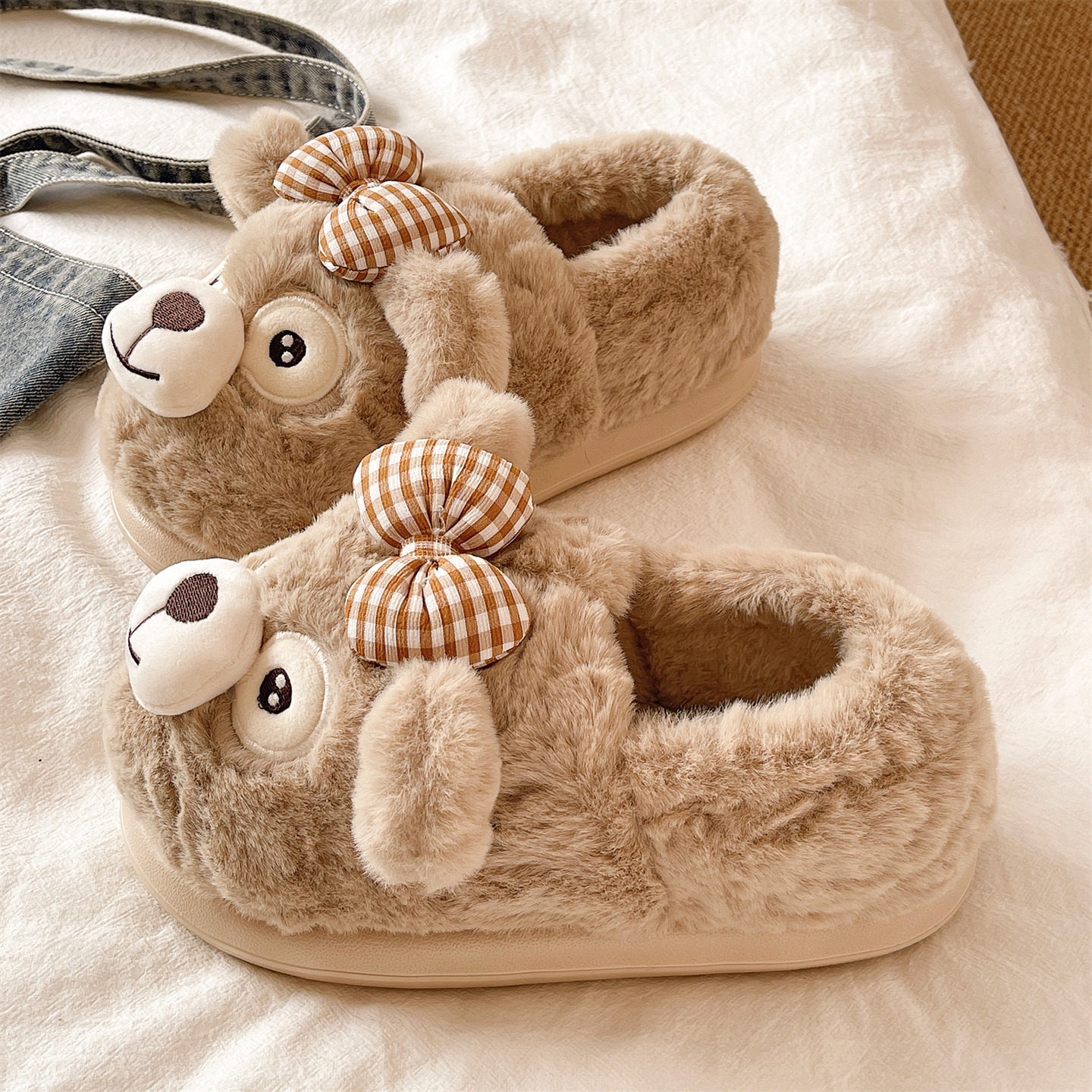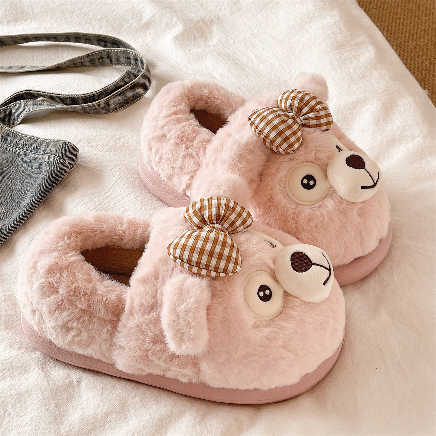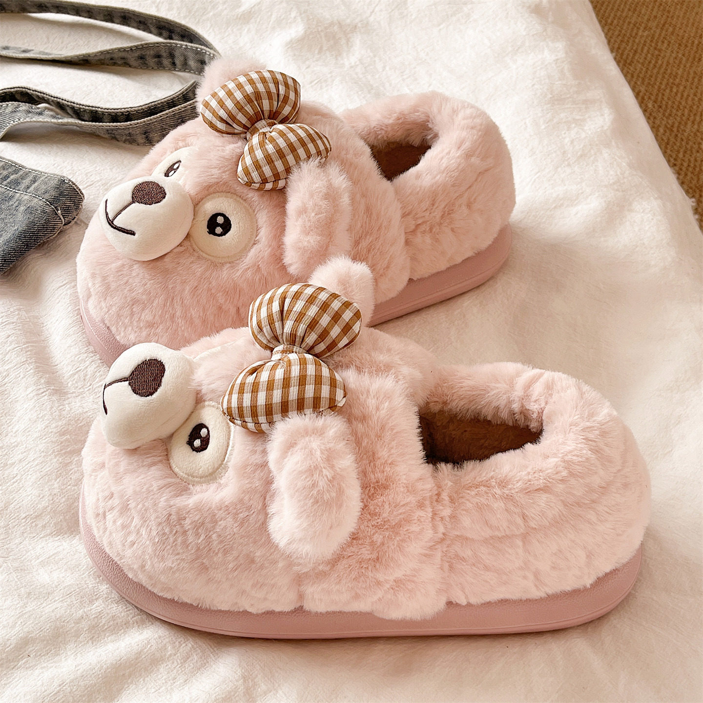 棉鞋女款冬季可爱蝴蝶结小熊居家室内厚底包跟月子保暖毛绒棉拖鞋