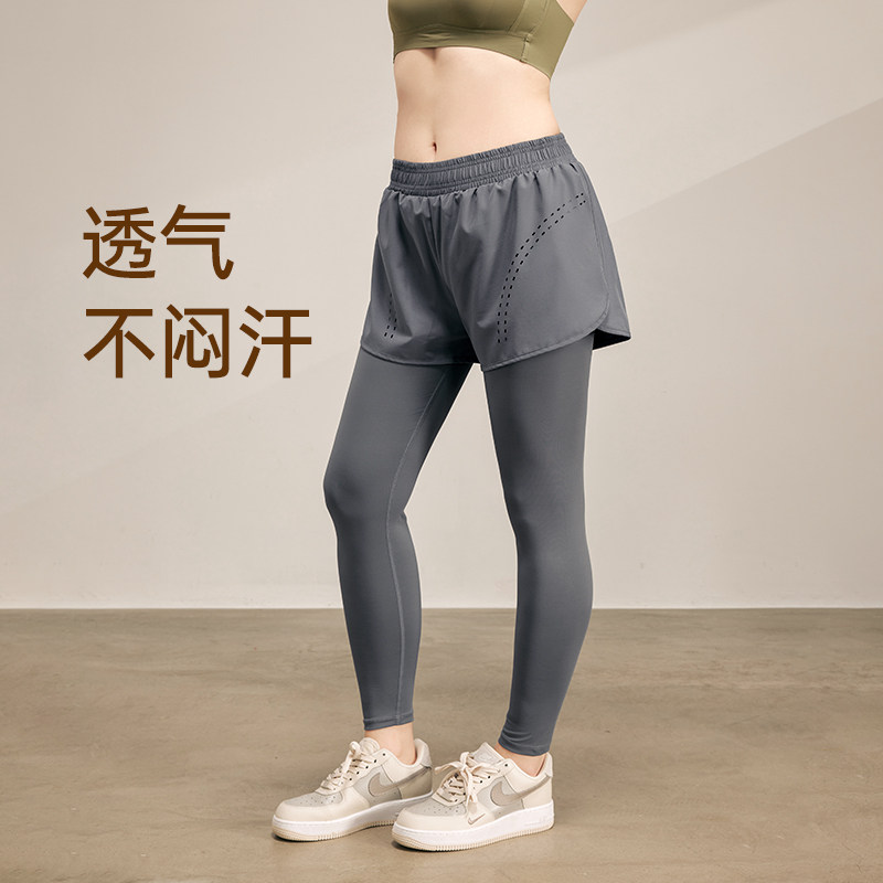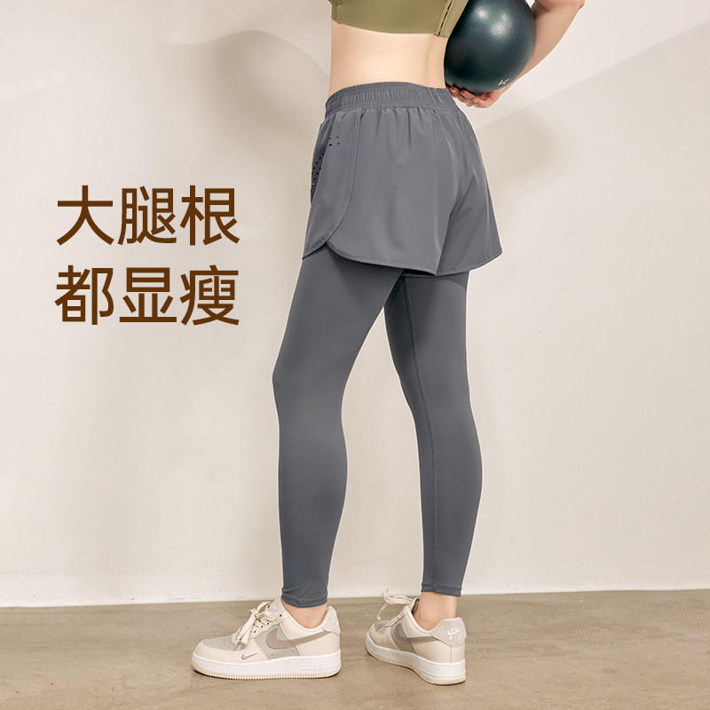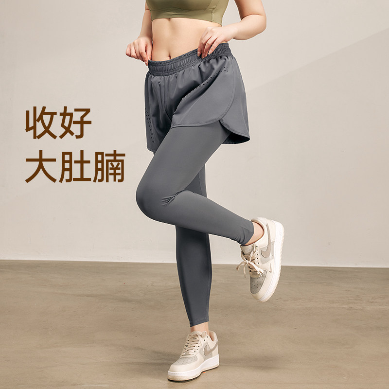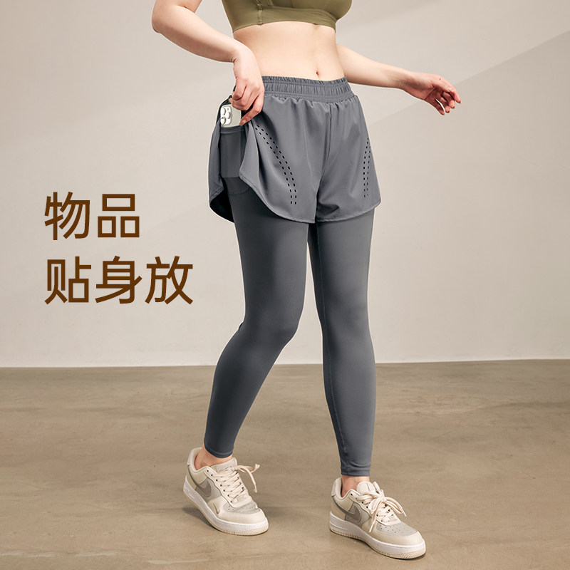 带口袋假两件运动裤女跑步速干健身裤高腰提臀透气紧身瑜伽裤秋冬