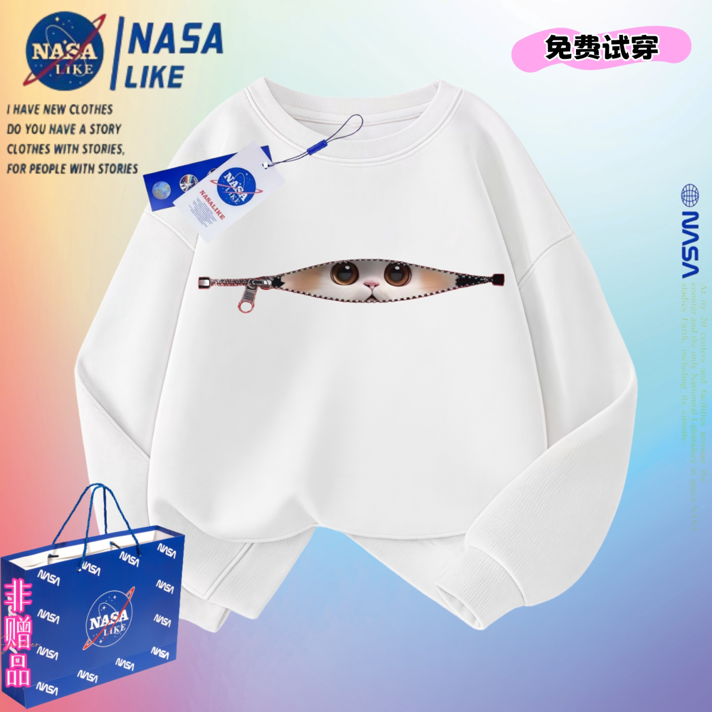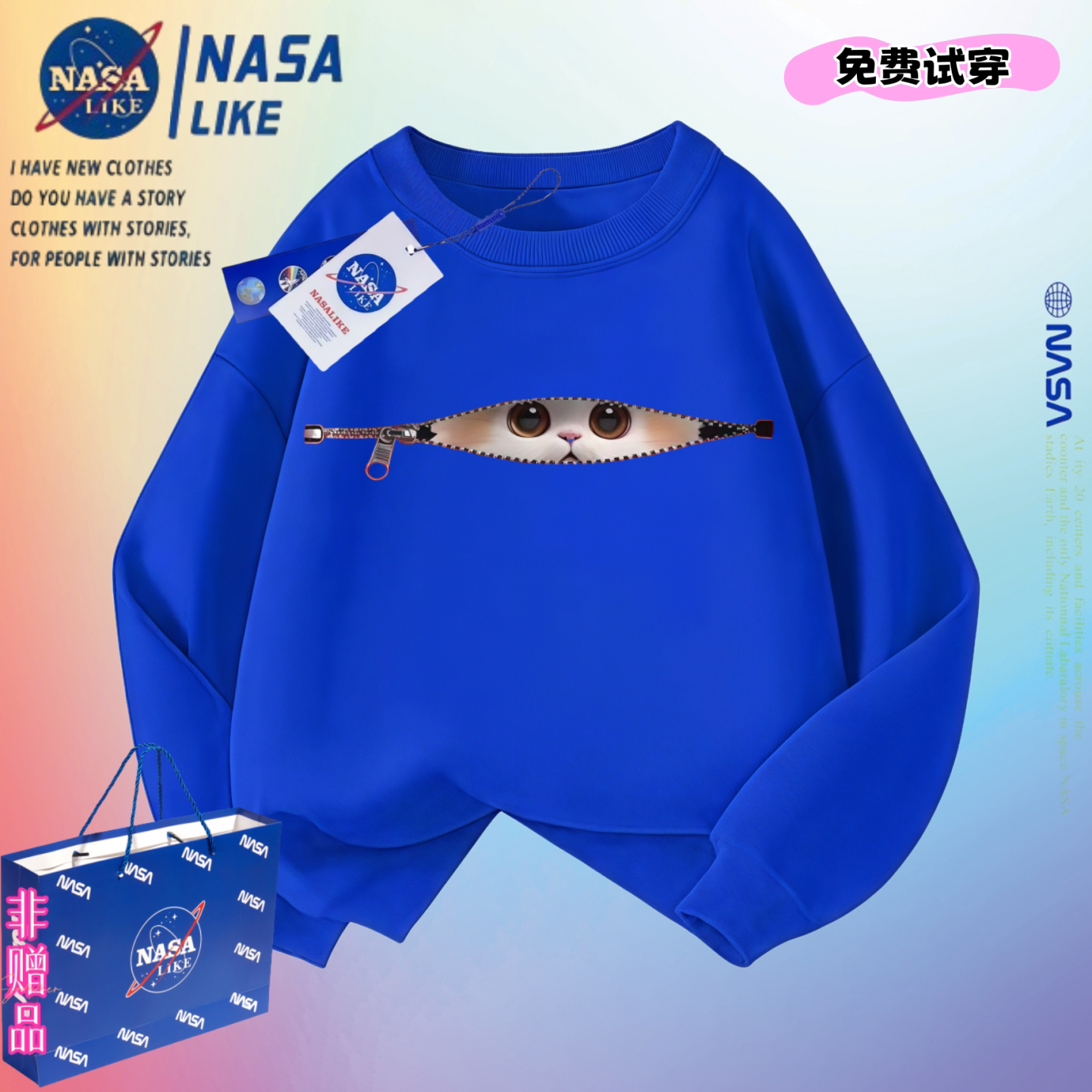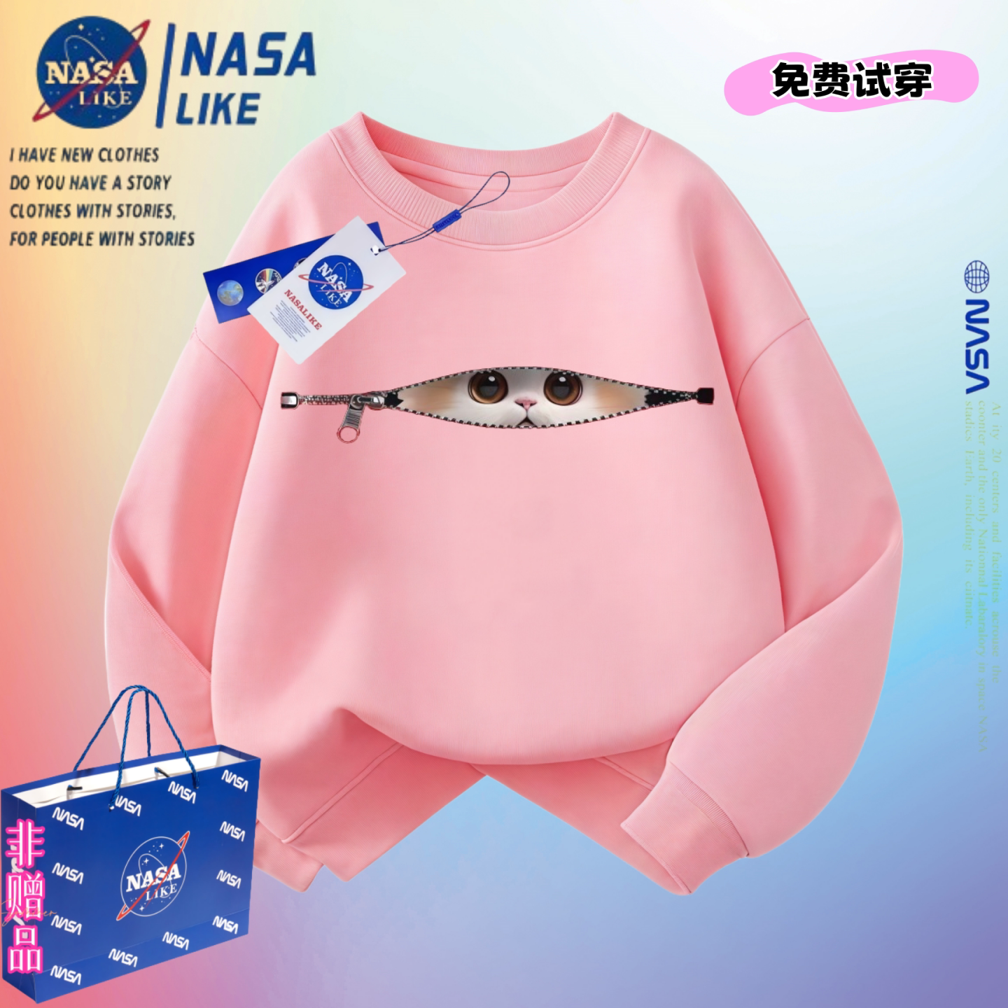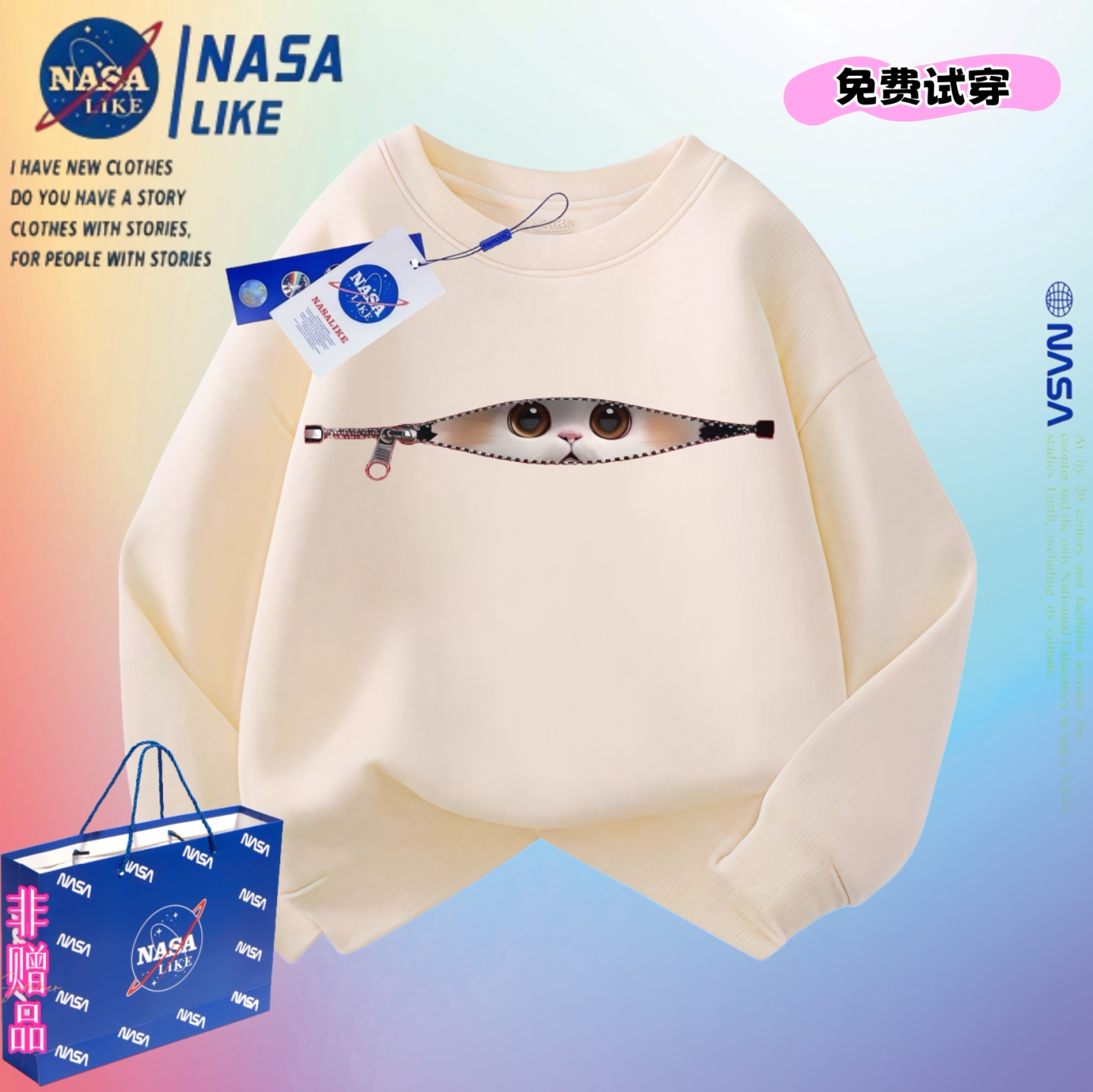 NASA 儿童圆领卫衣洋气潮牌童装男女童拉链小猫印花秋冬加绒上衣