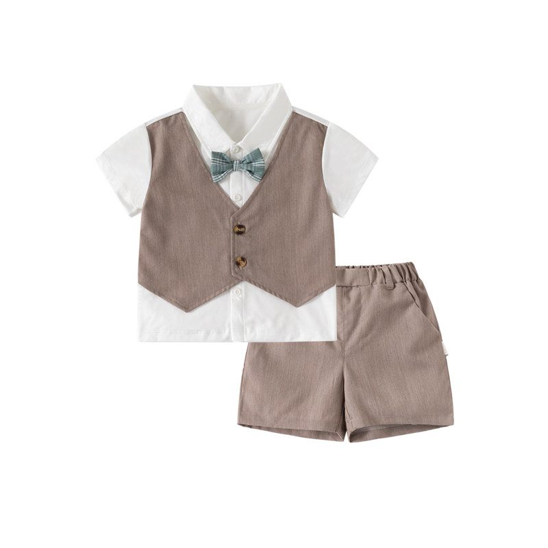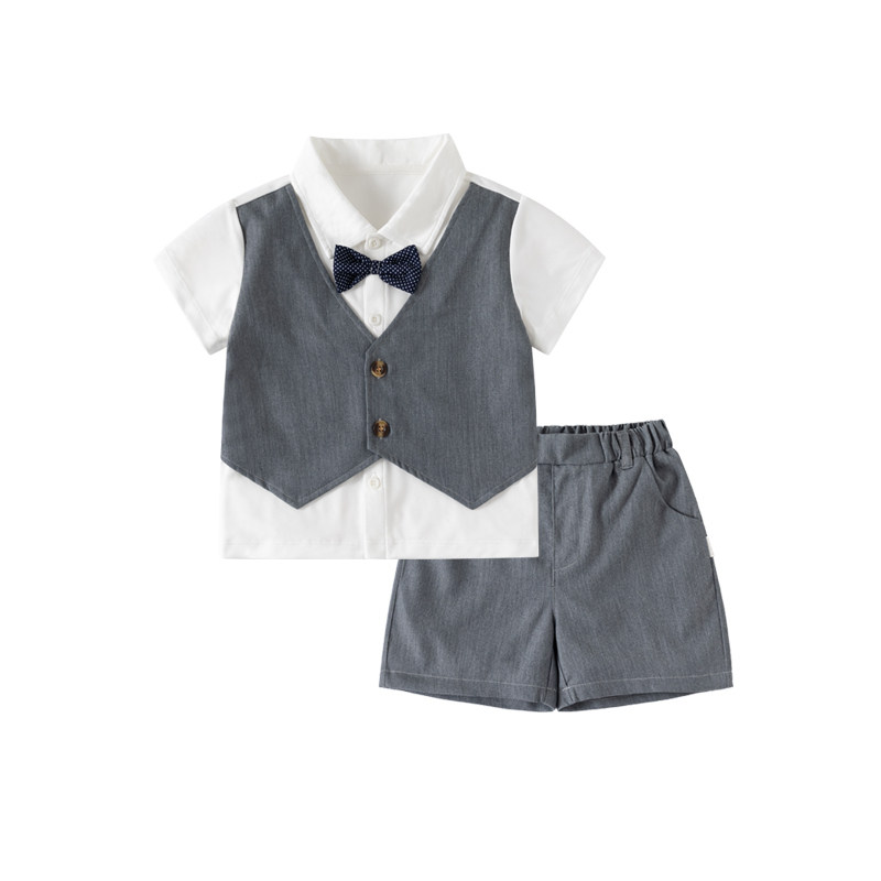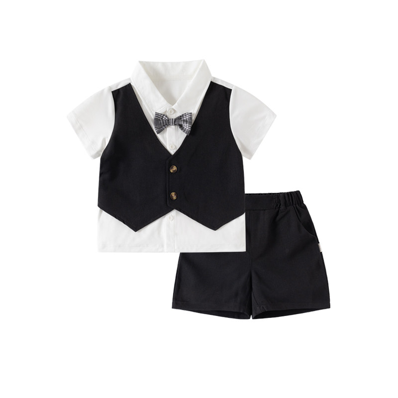 英伦风男童西装套装短袖马甲衬衫领结假三件套帅气绅士小礼服夏季
