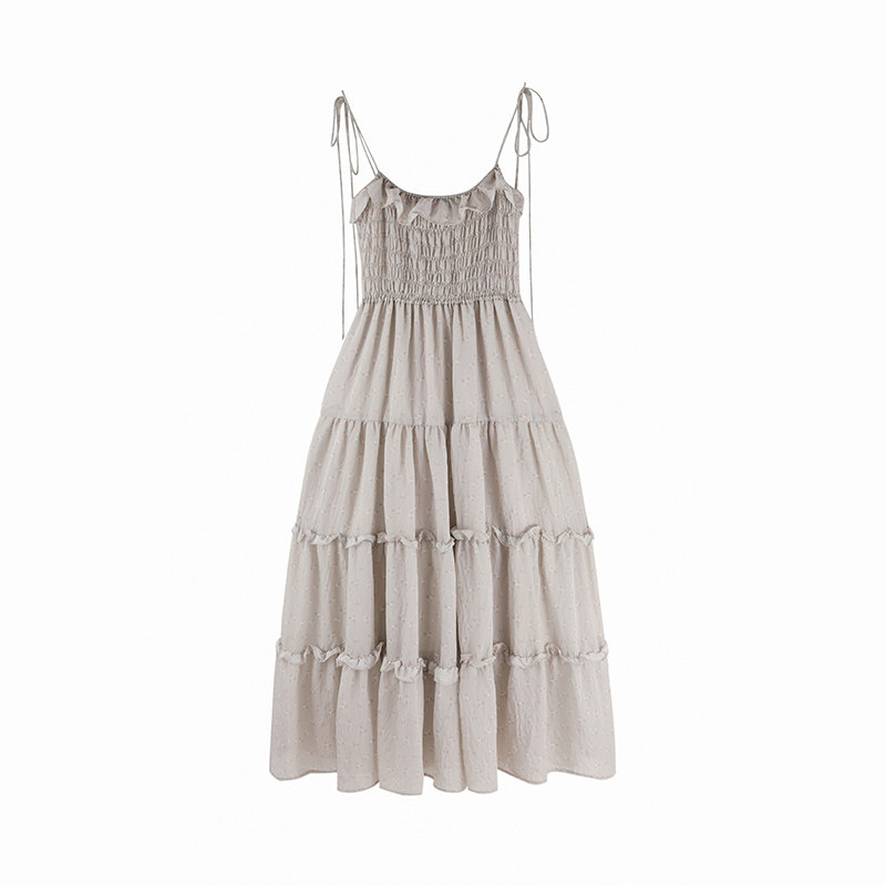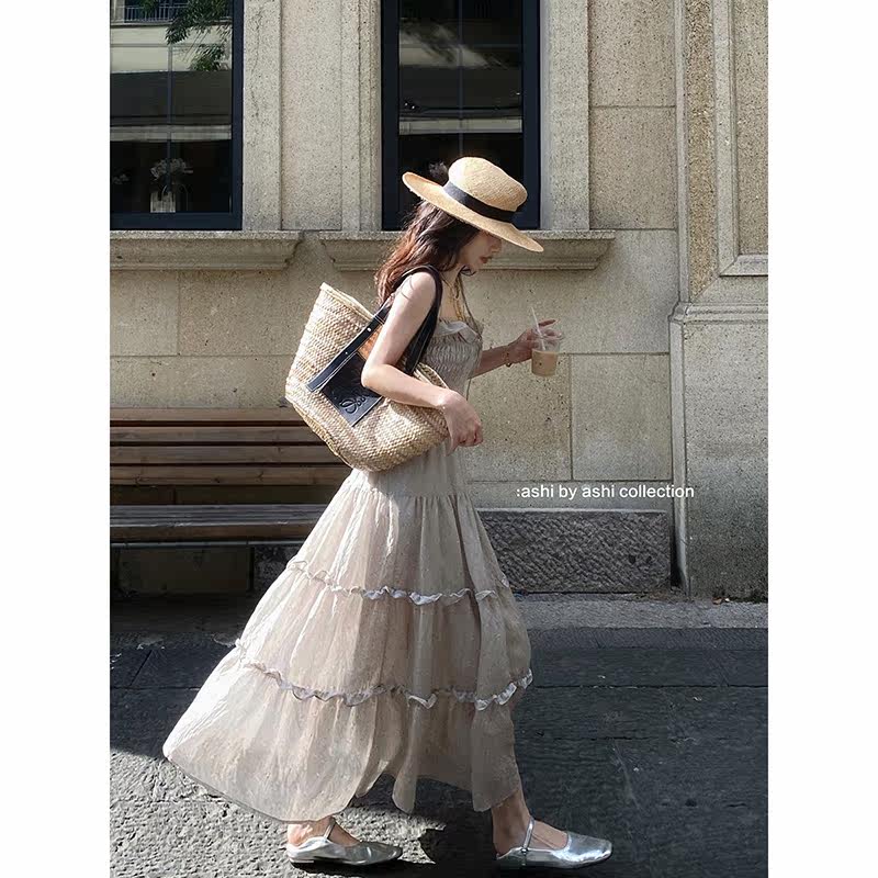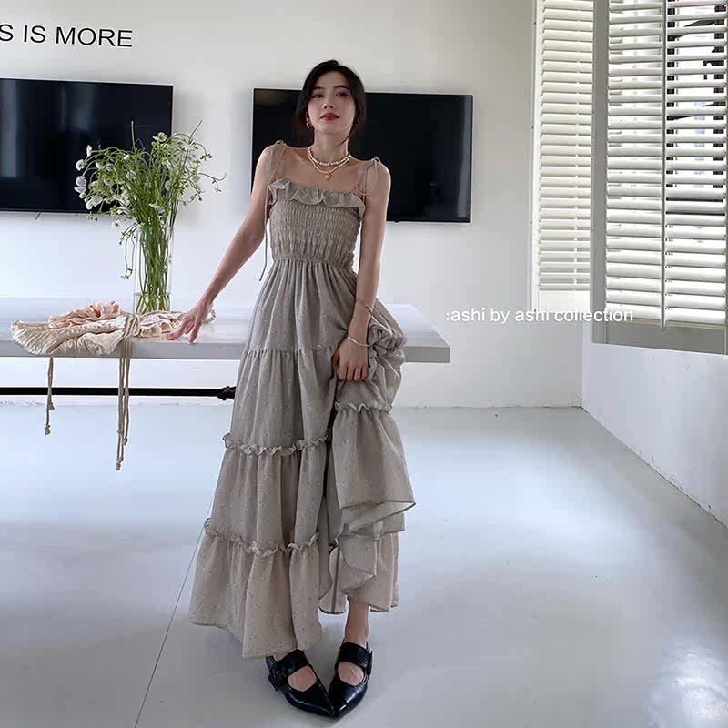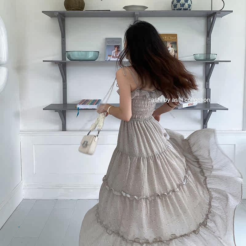 大于诗集法式碎花中长款吊带蛋糕裙女收腰显瘦荷叶边大摆连衣裙夏