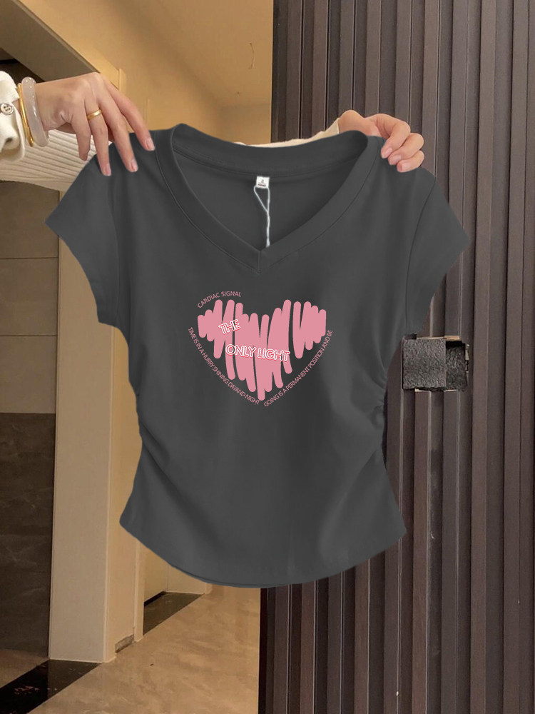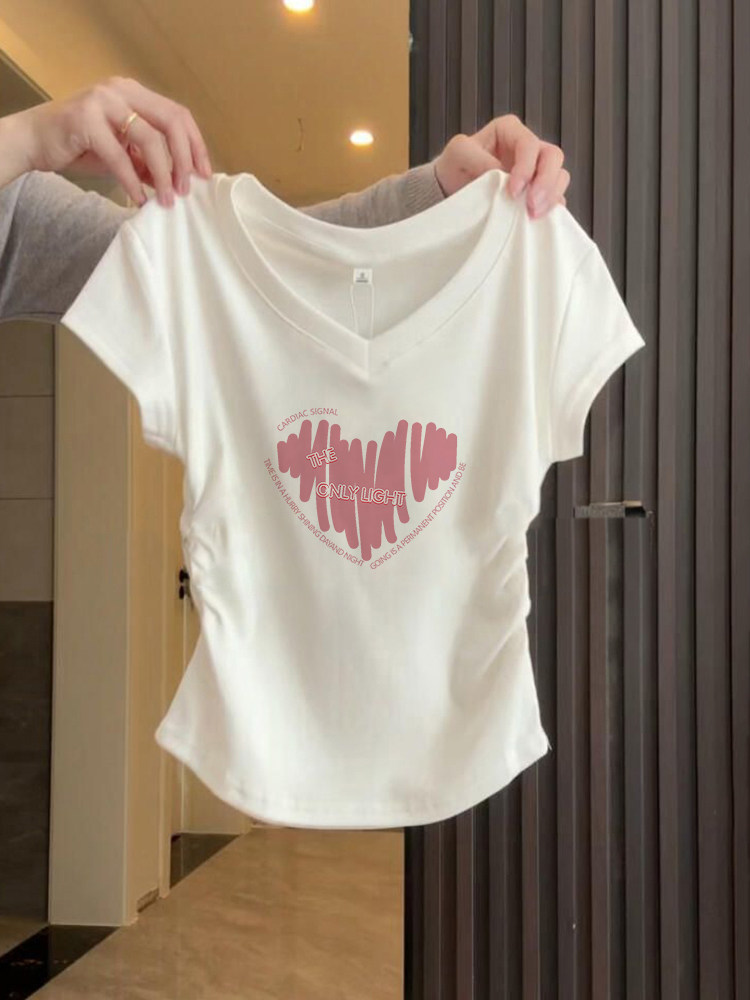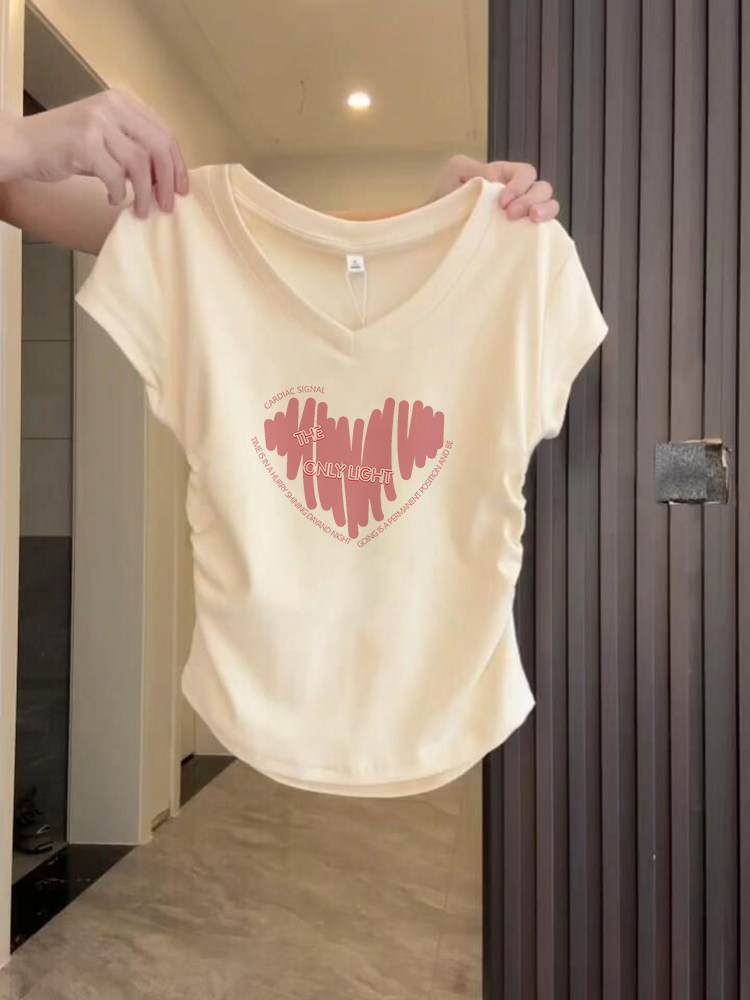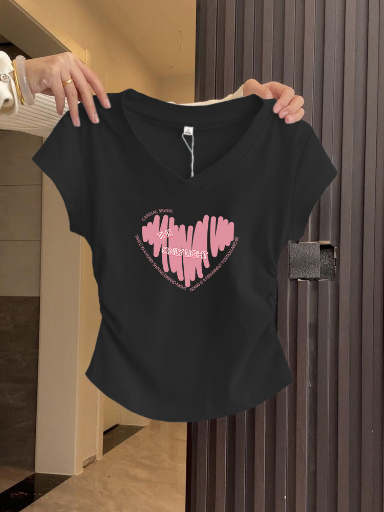 重磅v领正肩短袖t恤粉色爱心印花肩修身显瘦褶皱短款上衣女款夏季