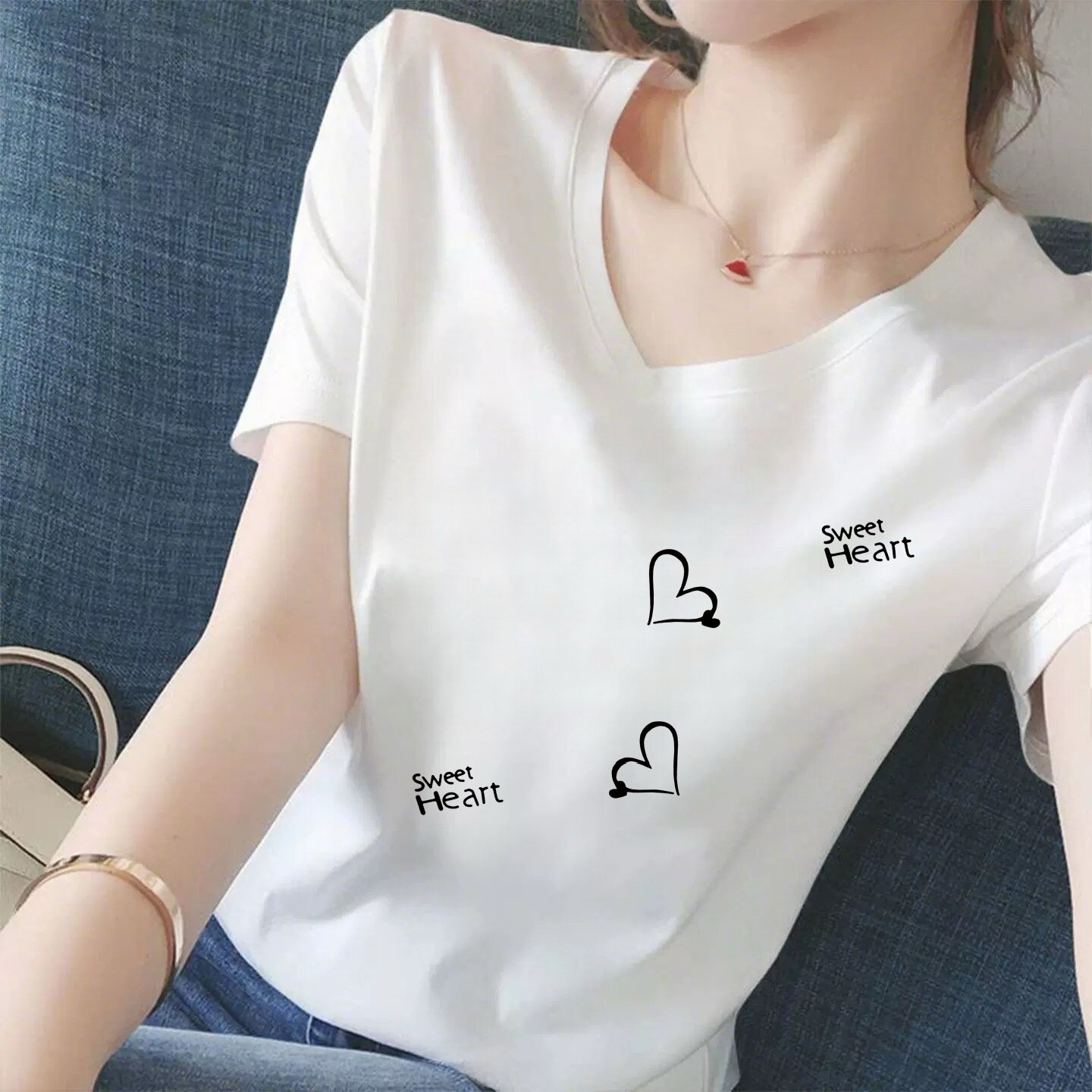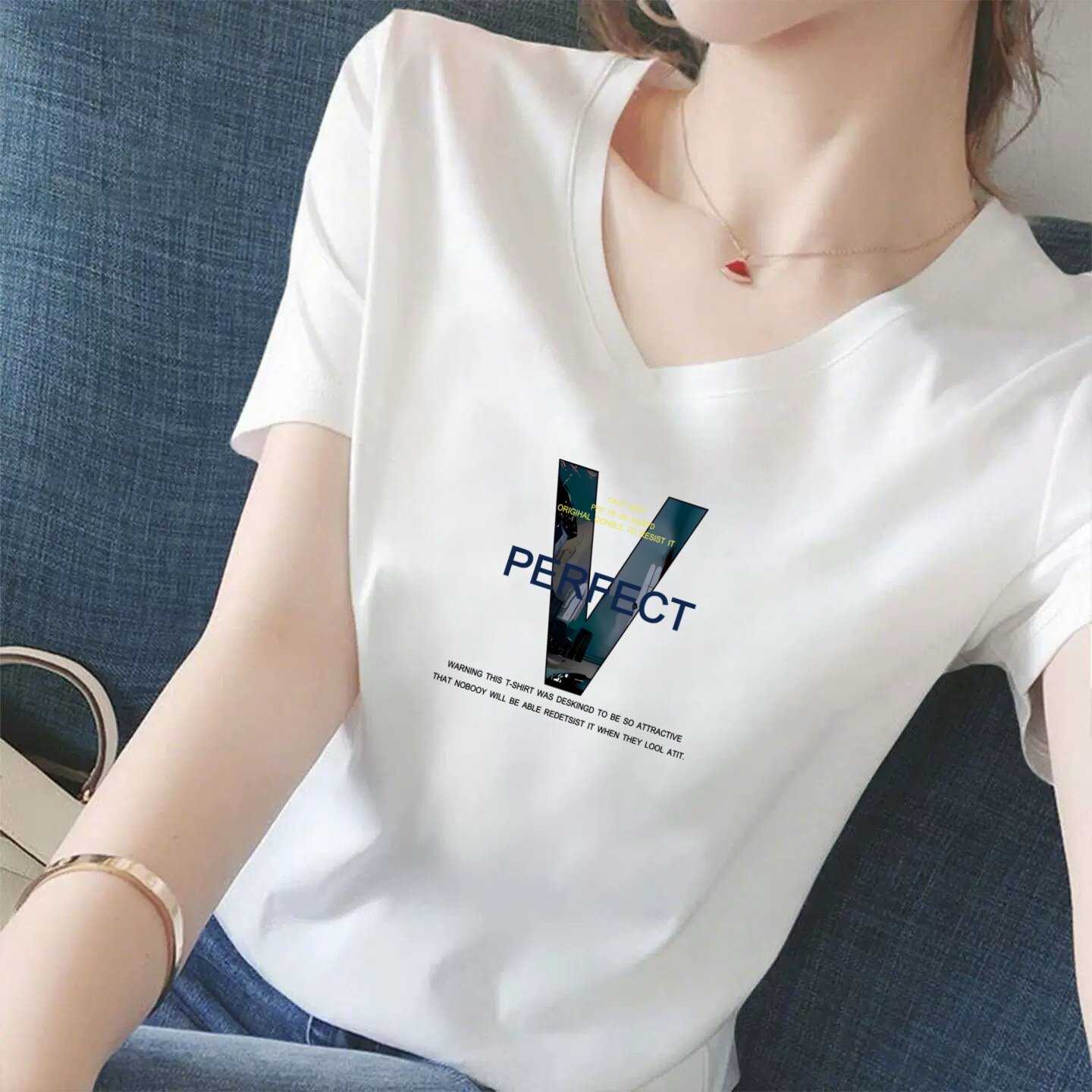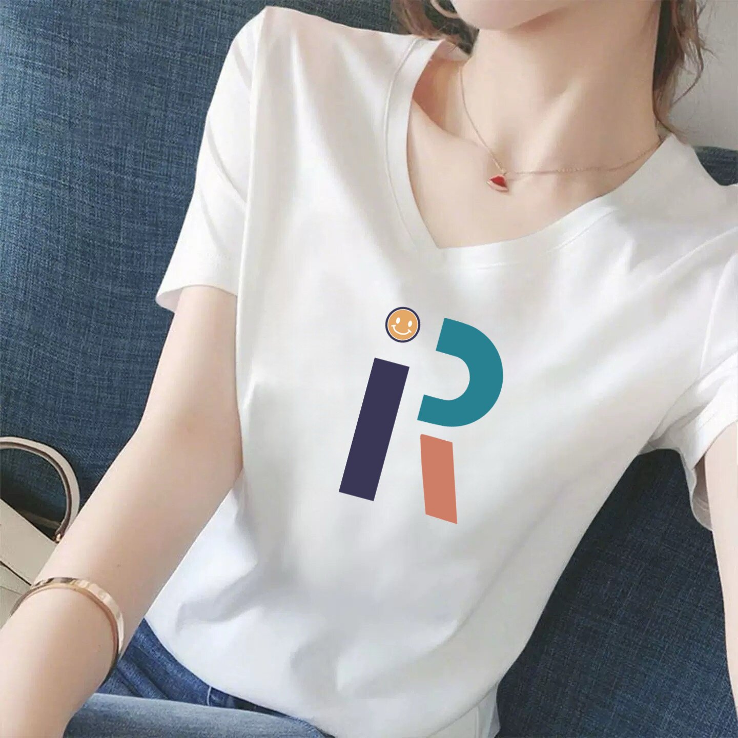 今年流行品牌白色V领短袖t恤女2026新款夏季宽松显瘦印花上衣爆款