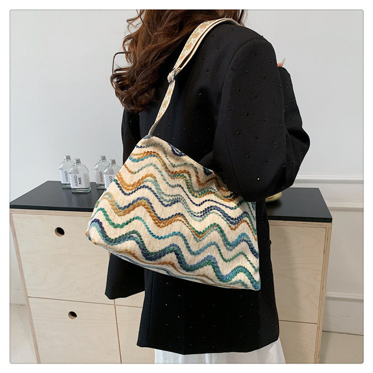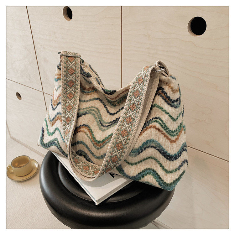 帆布条纹撞色大包包女2024春季新款休闲包大容量宽肩带单肩水桶包