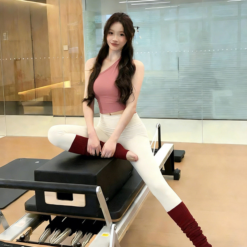 性感普拉提套装红色斜肩带胸垫运动背心跑步健身瑜伽美背上衣