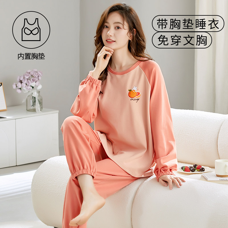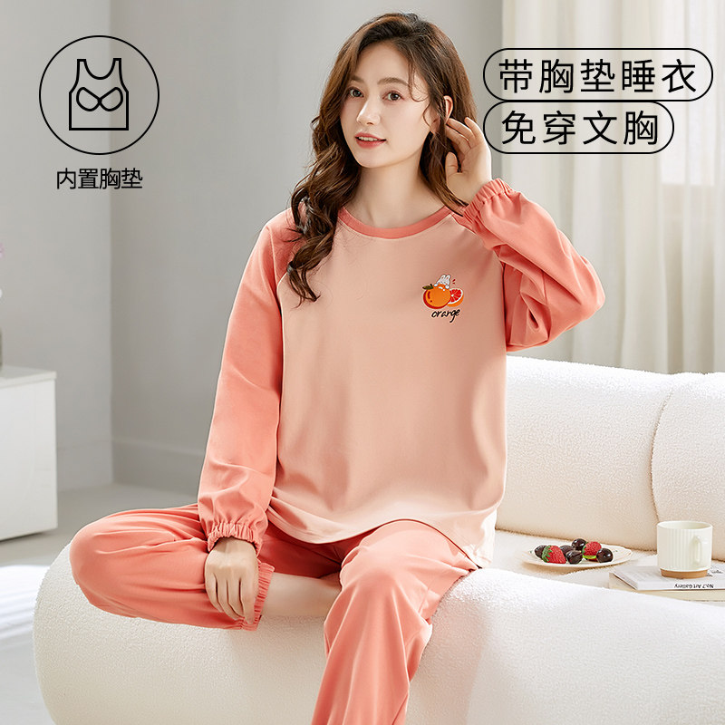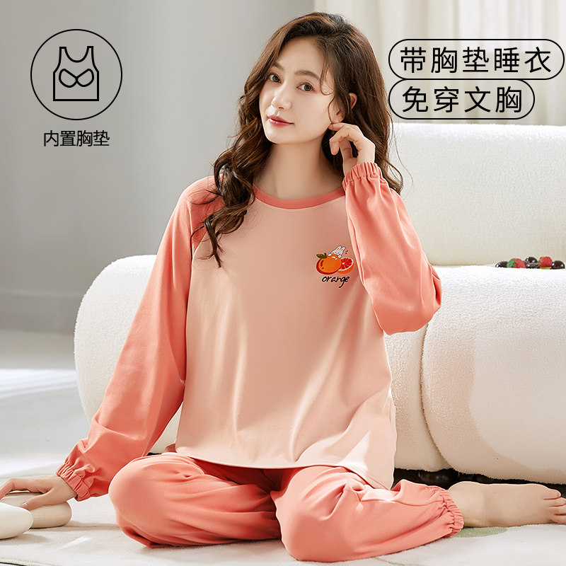 自带胸垫一体睡衣女款春秋季长袖人造棉韩版冬大码宽松家居服套装