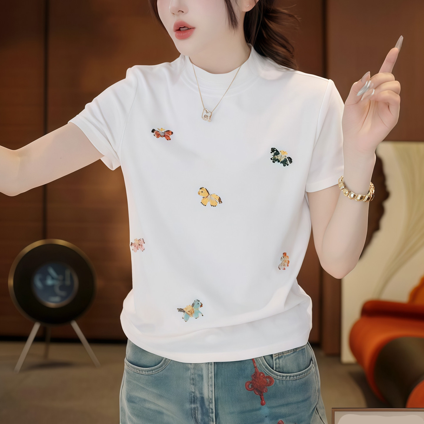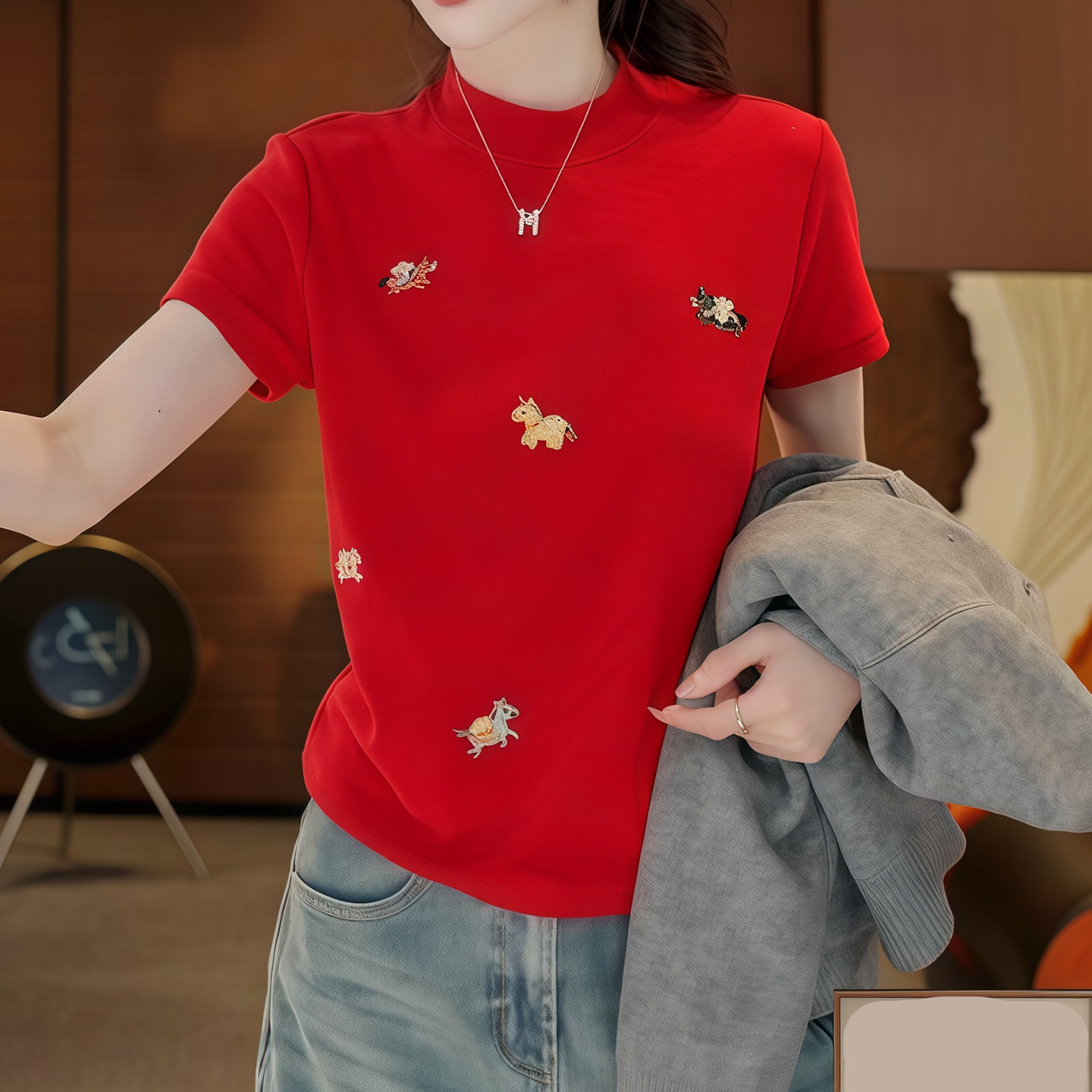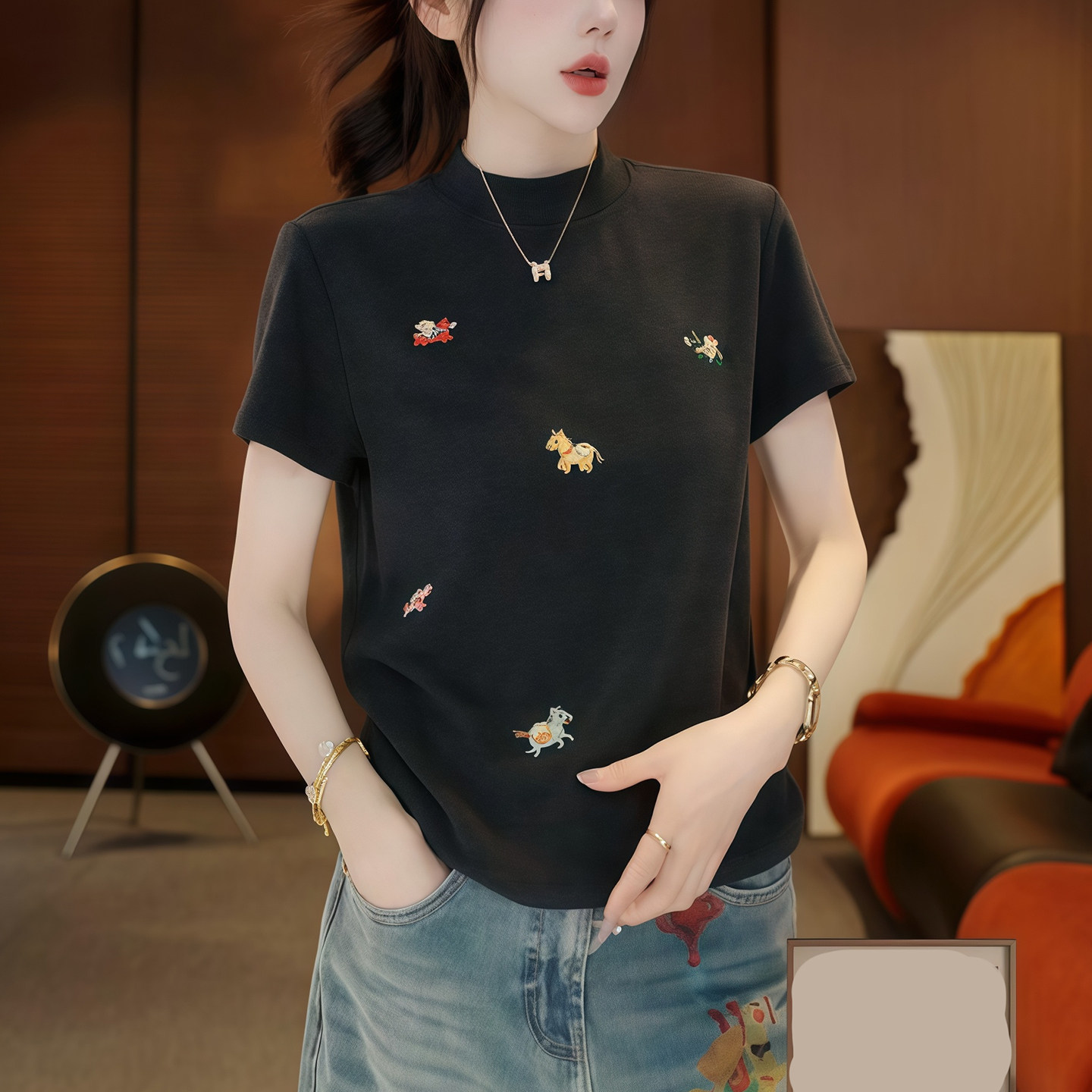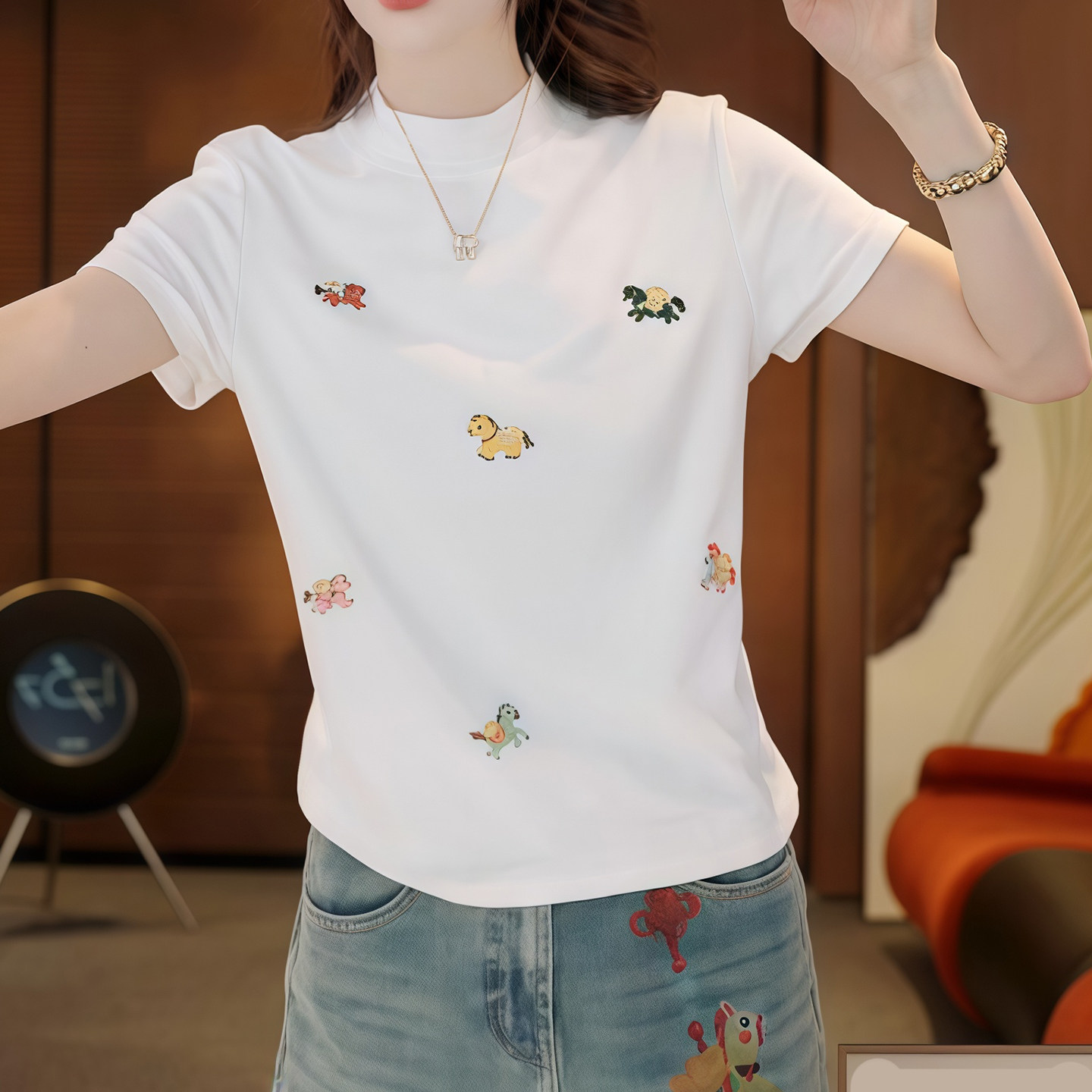 2026早春新款磨毛小马刺绣短袖t恤女宽松百搭大码胖mm女士上衣潮