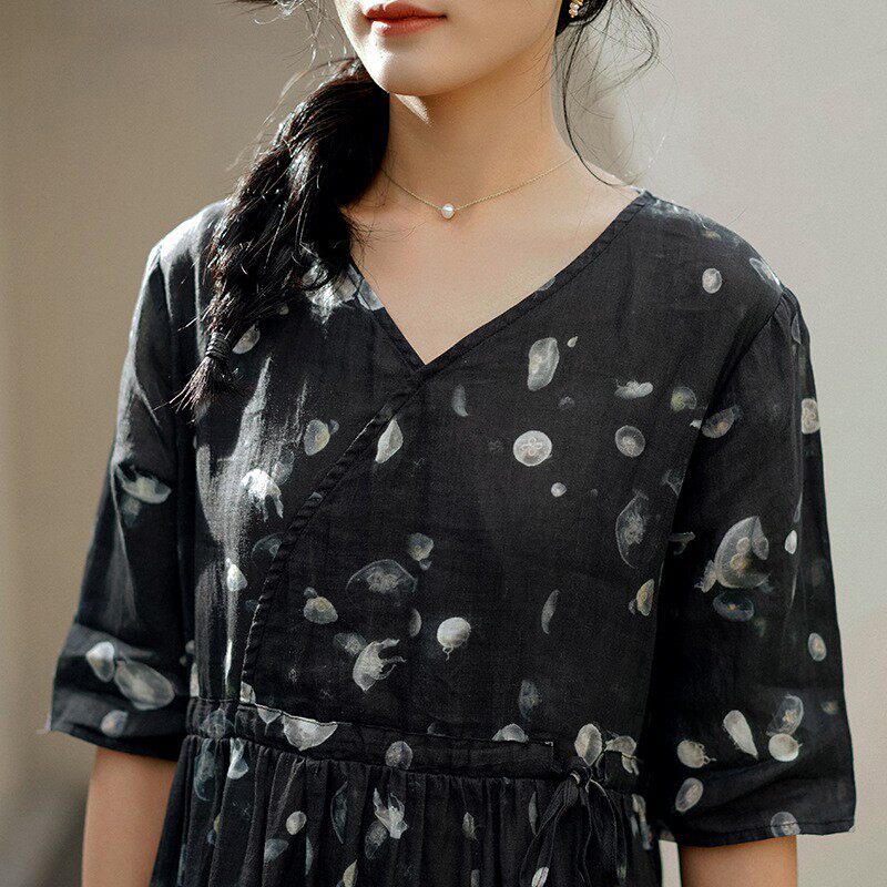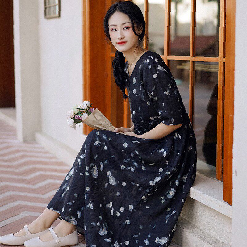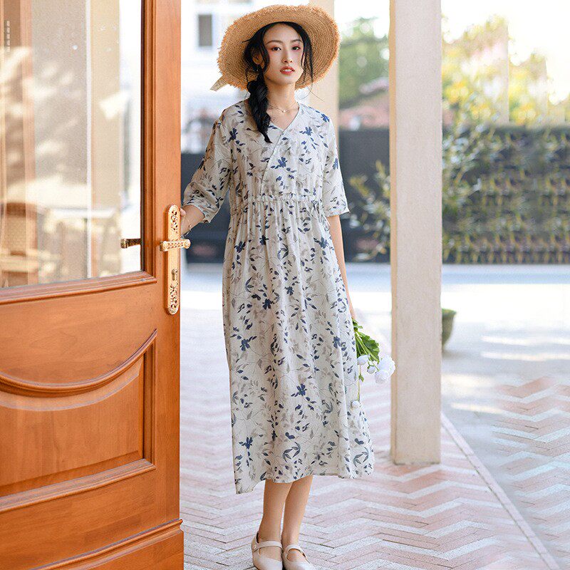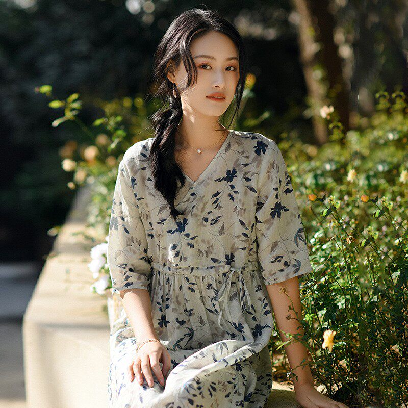 布衣美人原创2025新款短袖苎麻碎花连衣裙夏收腰气质文艺改良v领