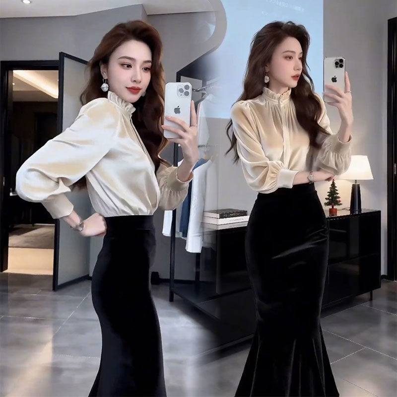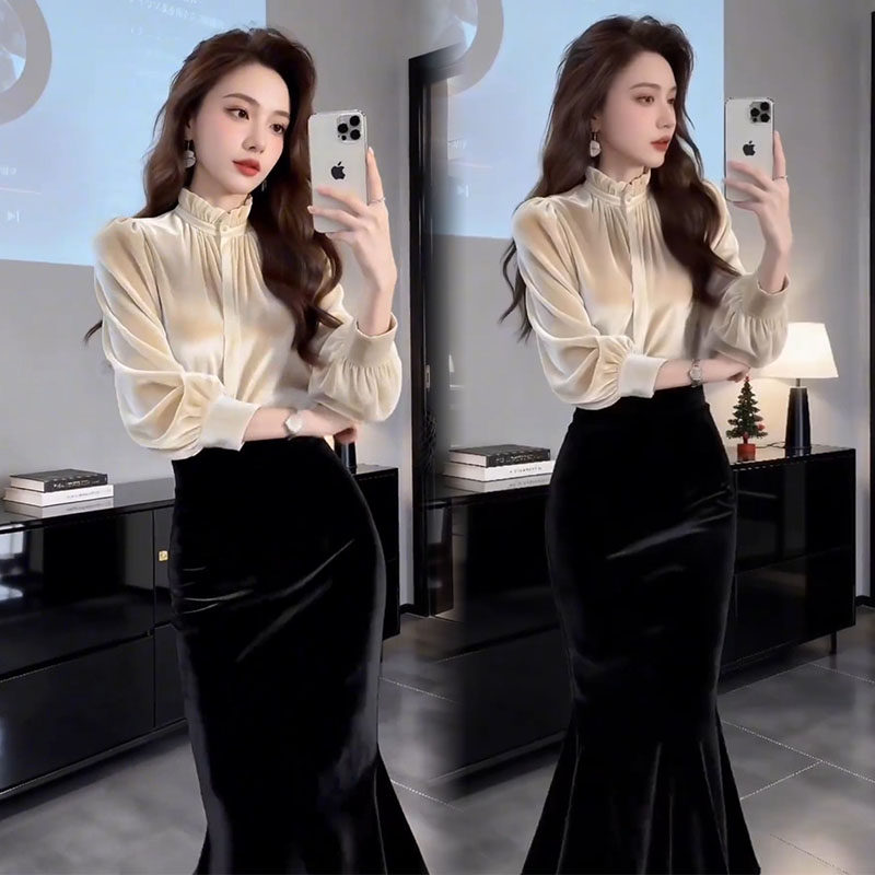 时尚套装2026早春新款气质女人味木耳边衬衫鱼尾裙高档丝绒两件套