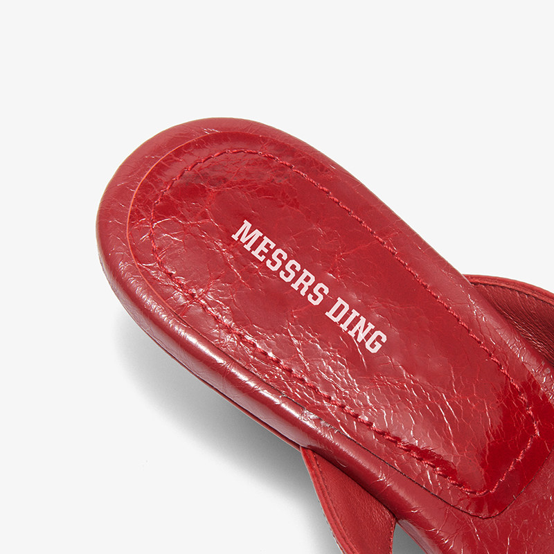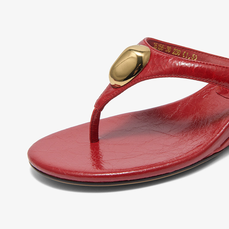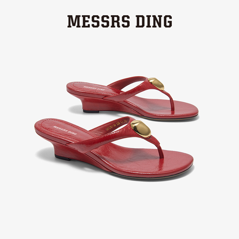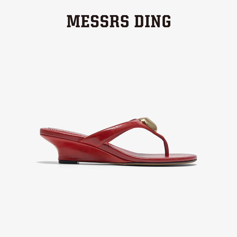 MD女鞋·时尚金属感坡跟凉拖鞋真皮人字拖红色夏季气质夹趾凉鞋女
