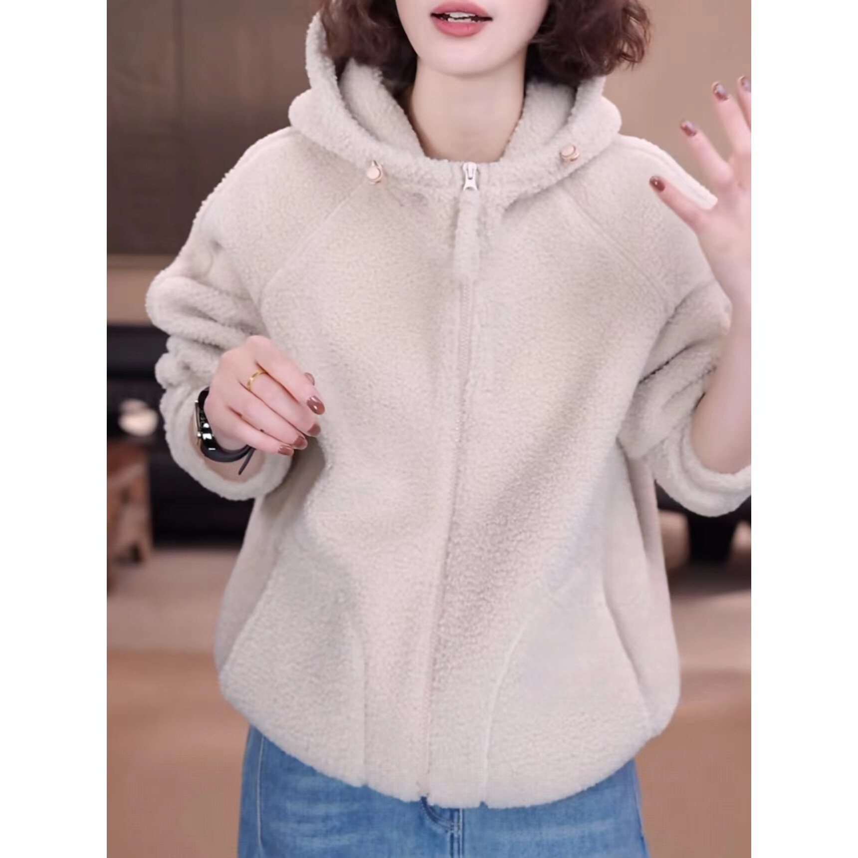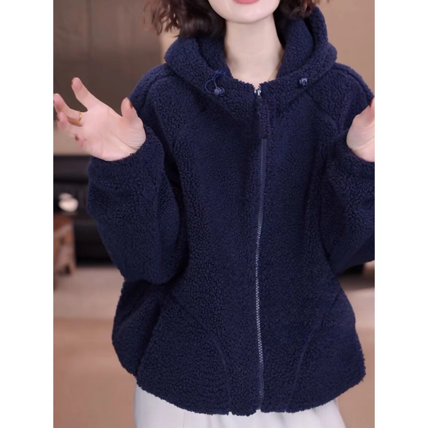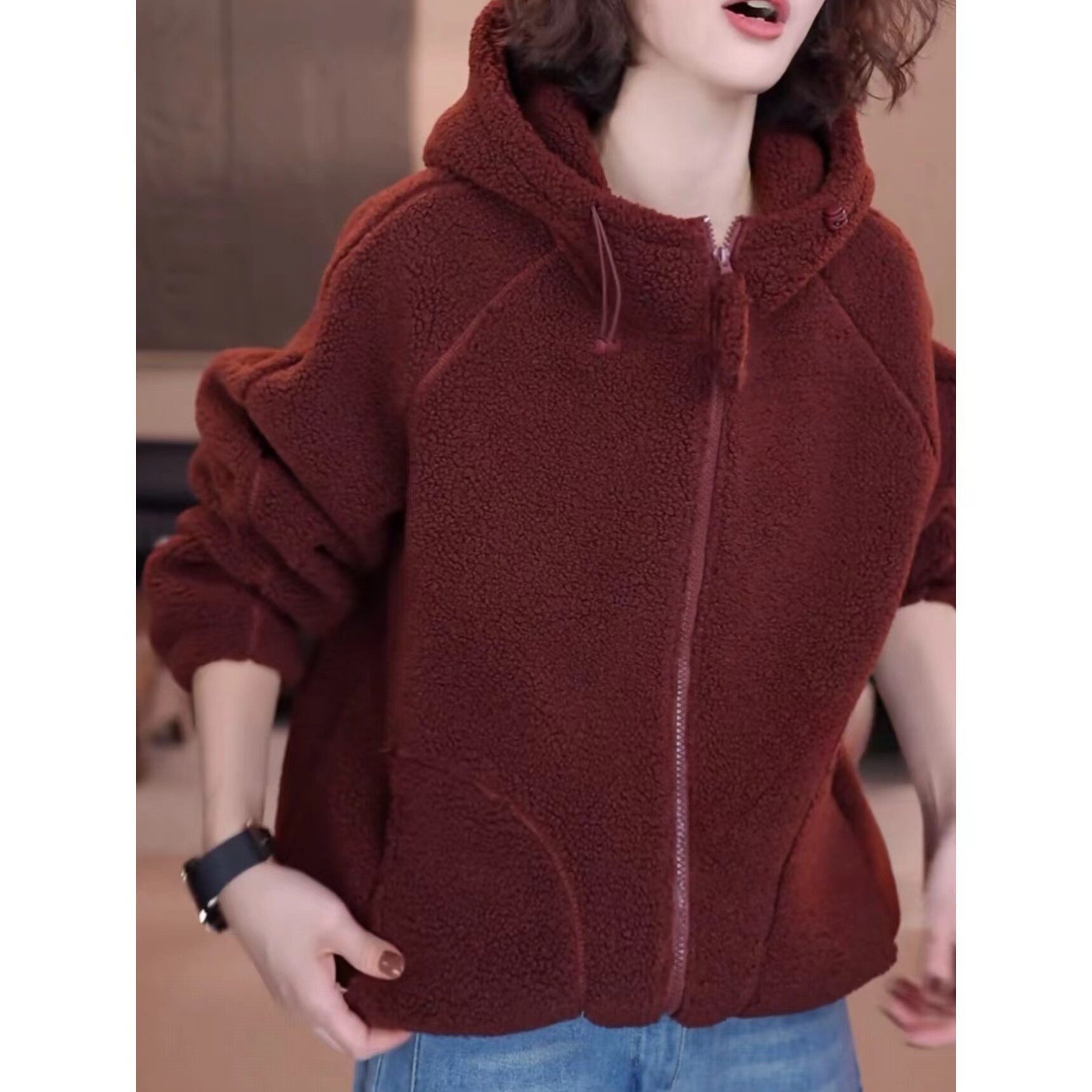 纯色连帽摇粒绒复合奥粒绒加厚抽绳外套女2026新款休闲百搭卫衣潮
