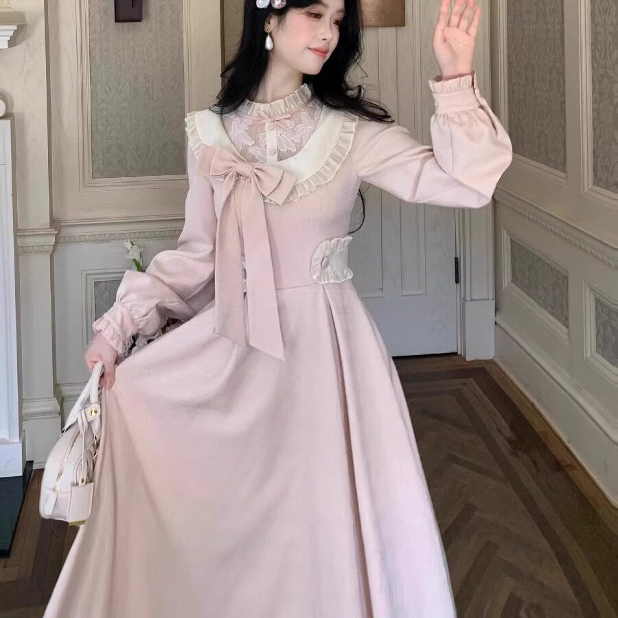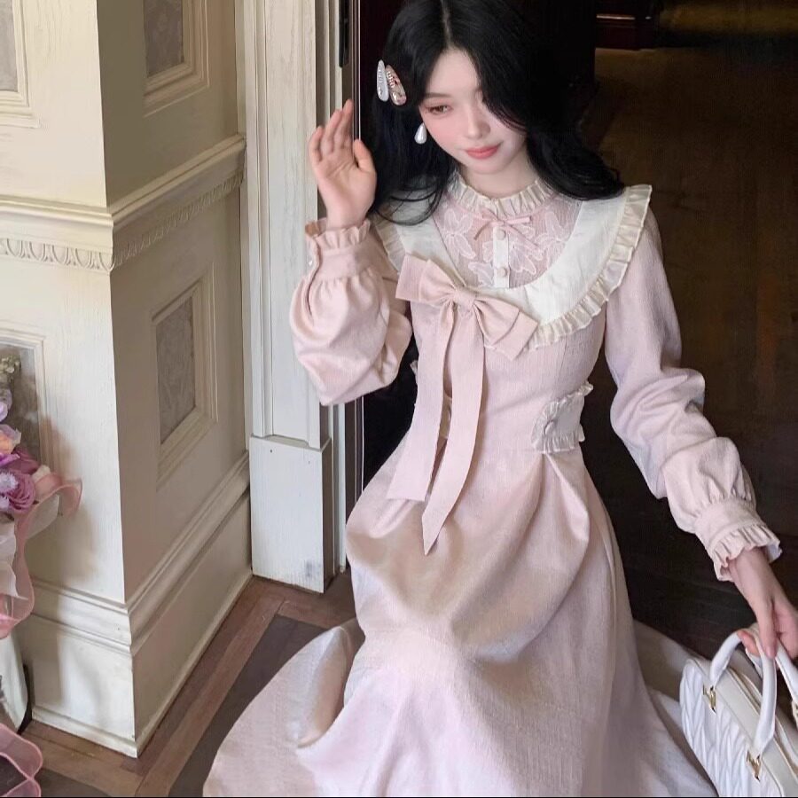 大码胖mm千金小香风蕾丝花边蝴蝶结粉色连衣裙女秋冬显瘦公主长裙
