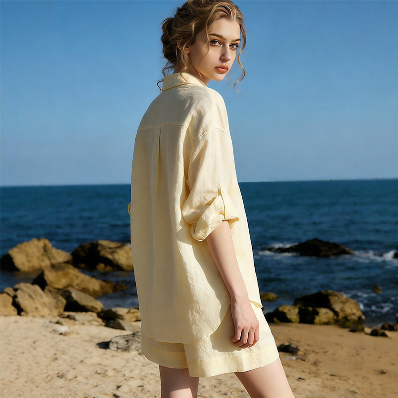黄色长袖亚麻衬衫女款2026新款夏季超火休闲女士防晒上衣短裤套装