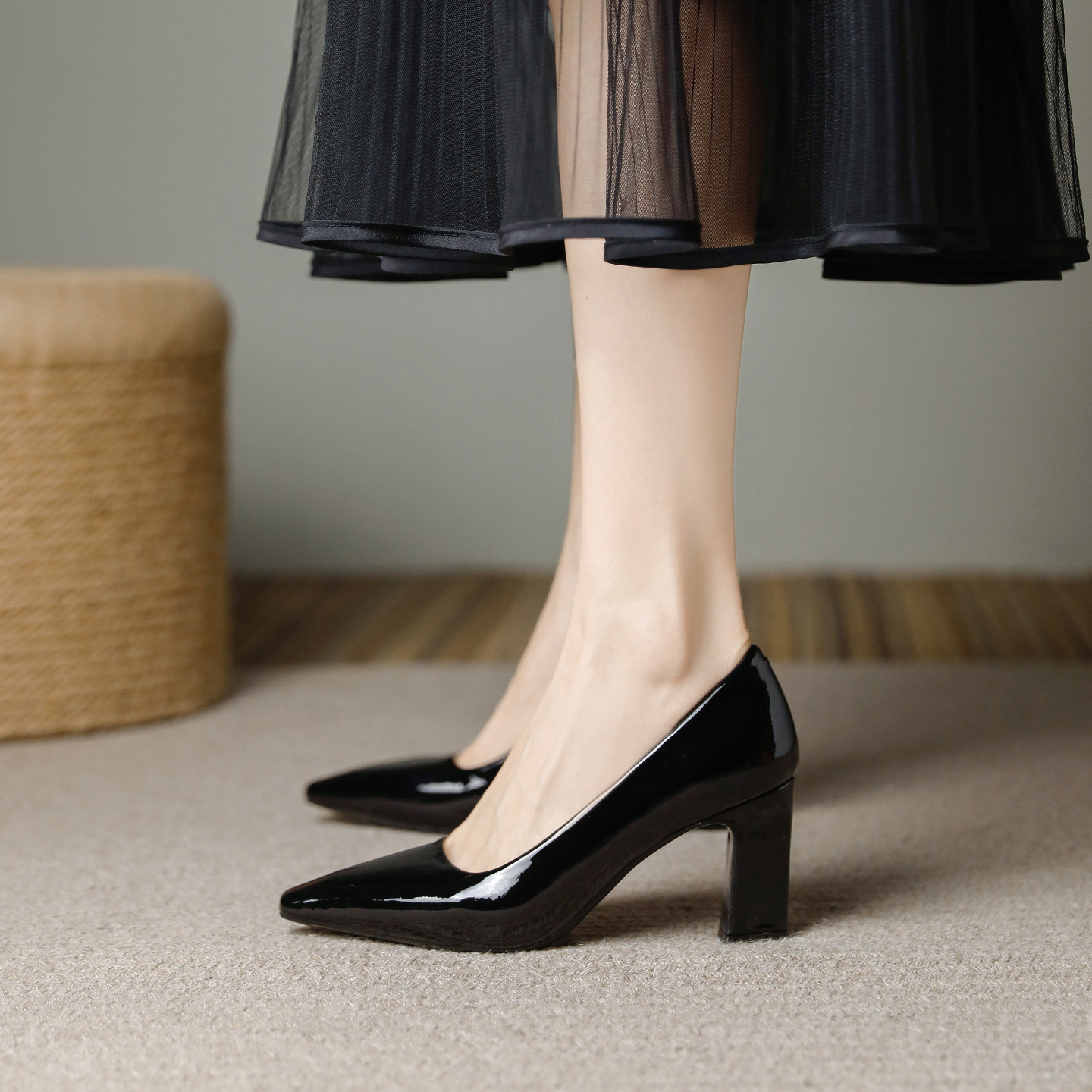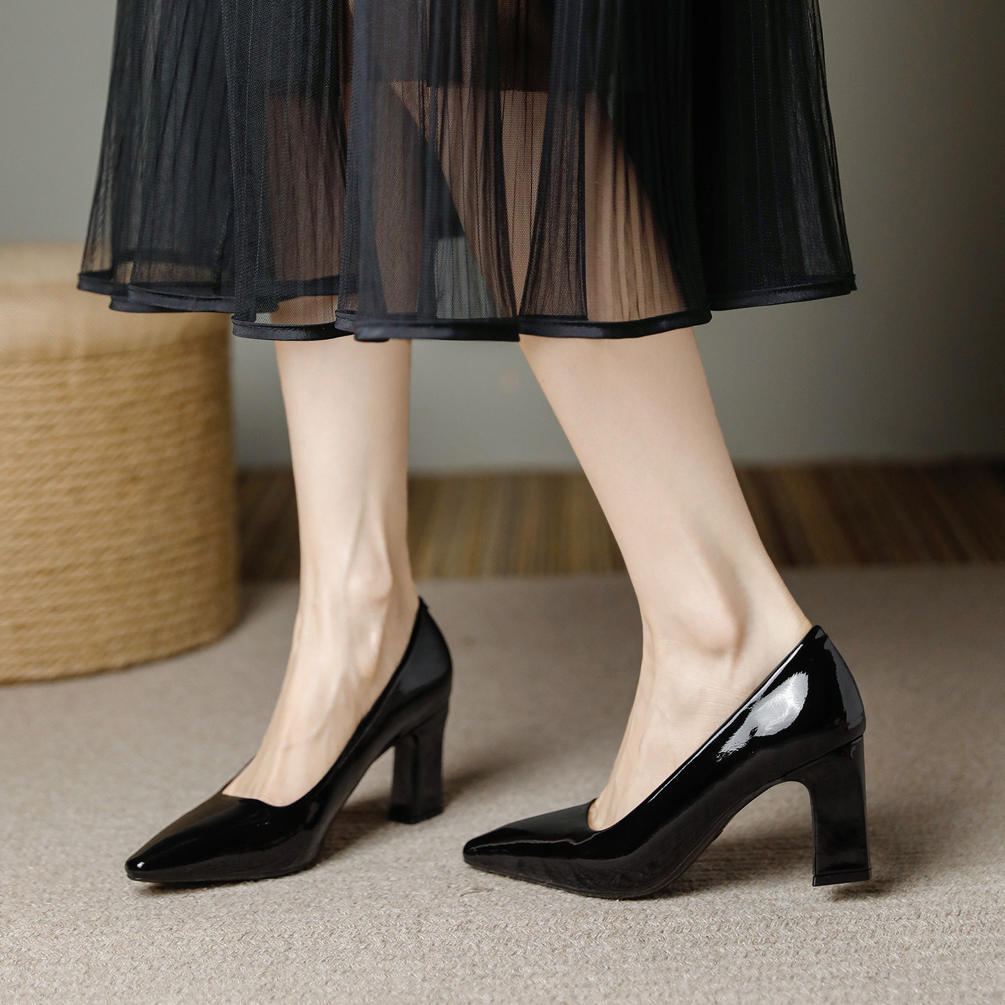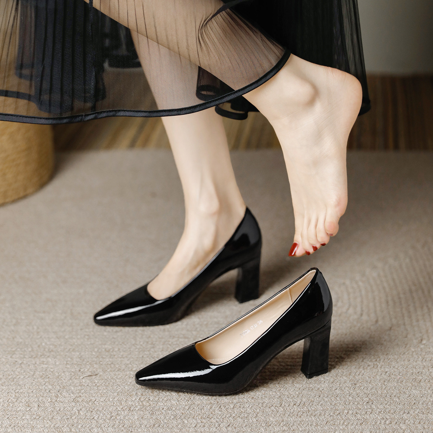 羊皮版~黑色亮皮粗跟小方头高跟单鞋女7cm2026春款面试职业工作鞋