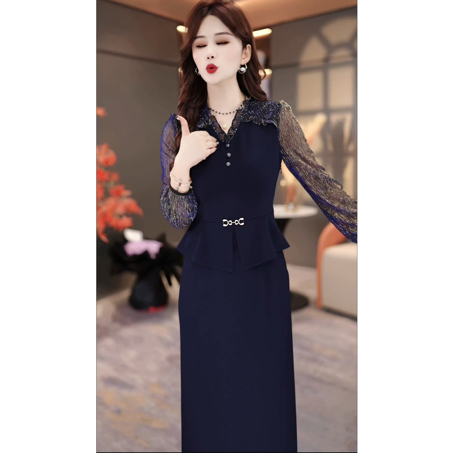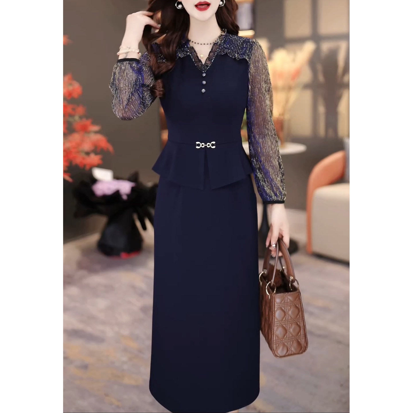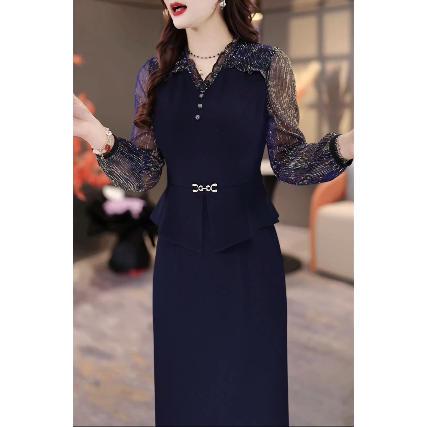 长袖高档V领假两件连衣裙女2026春秋新款轻奢高级感妈妈显瘦裙子