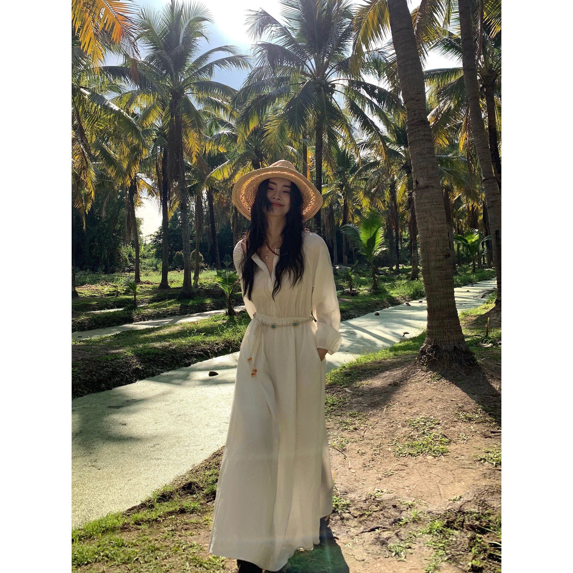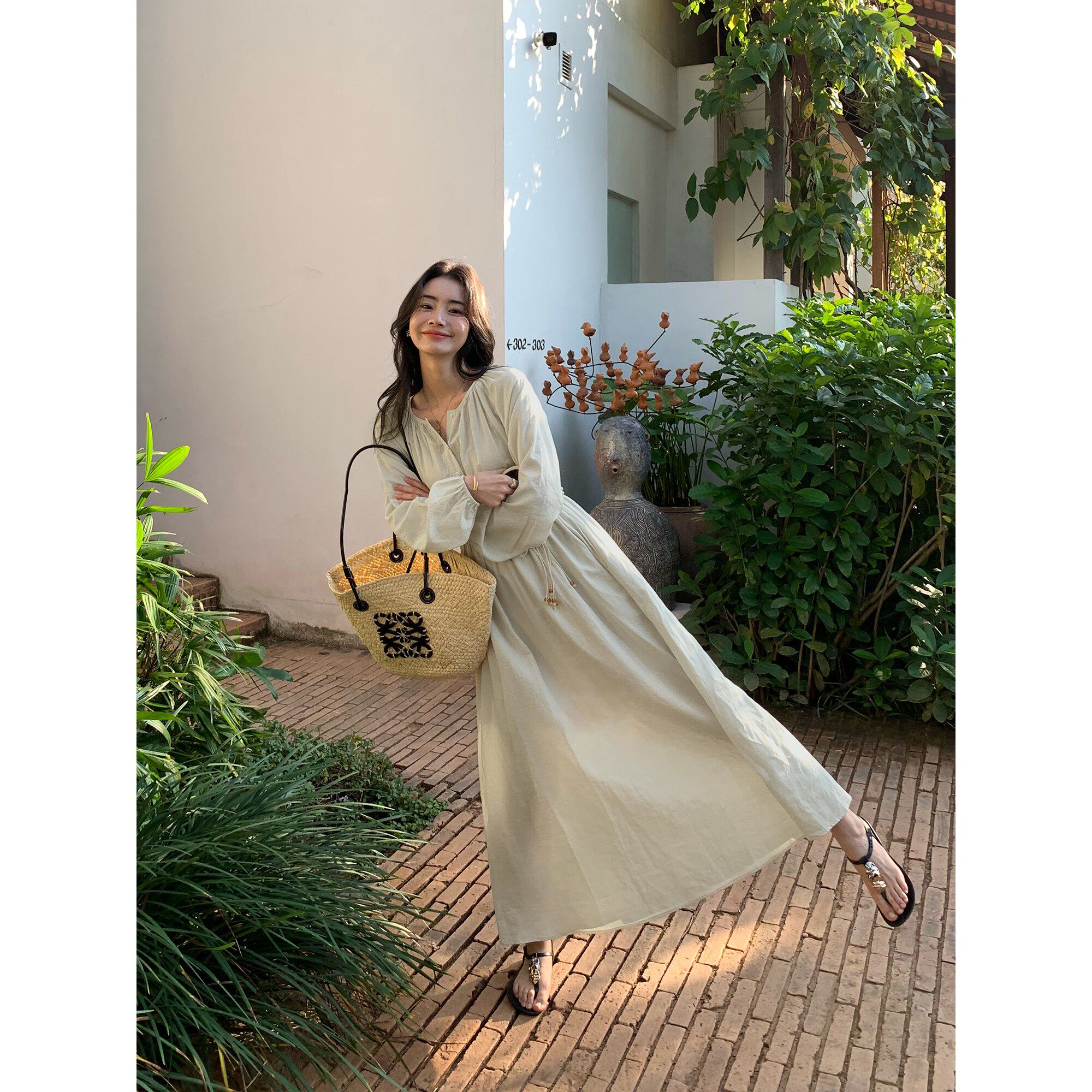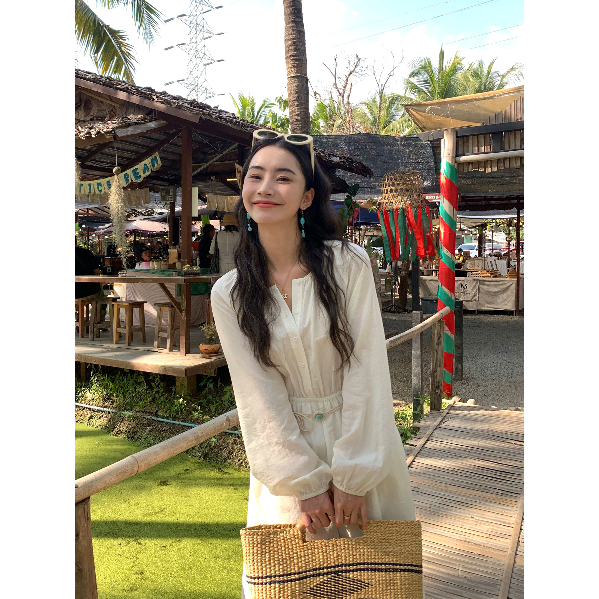 pusumede 解锁假日 法式复古圆领长袖连衣裙女收腰气质度假风裙子