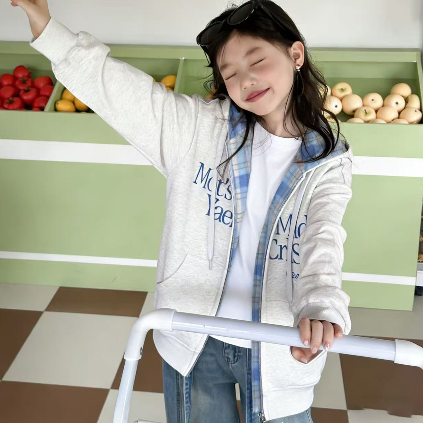 女童连帽外套2026春装新款儿童韩系格子拼接卫衣大童春秋刺绣上衣