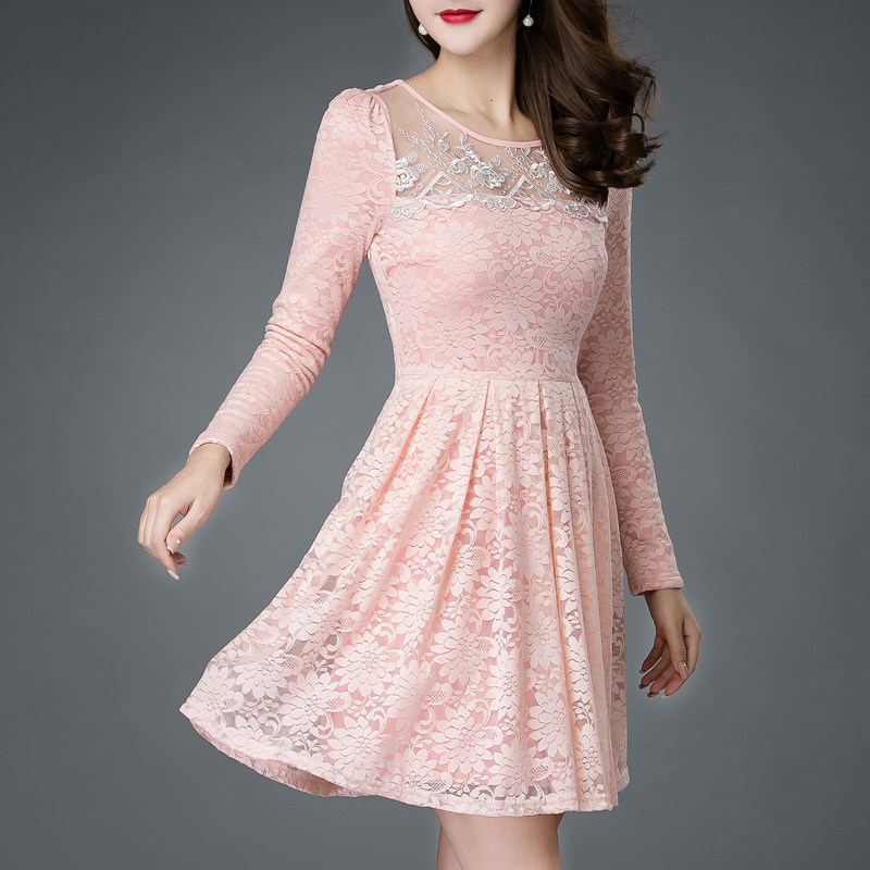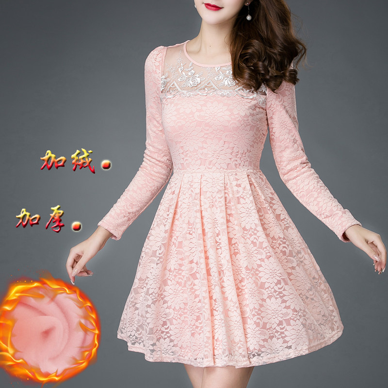 2023冬季新款加绒加厚蕾丝连衣裙中长款保暖打底裙胖mm遮肚子冬裙