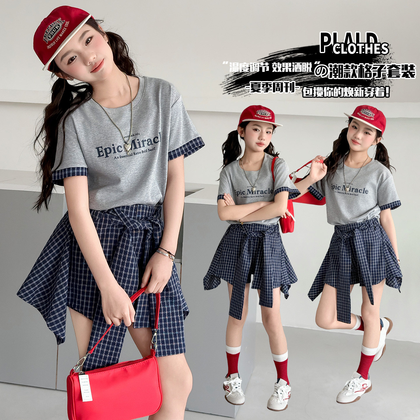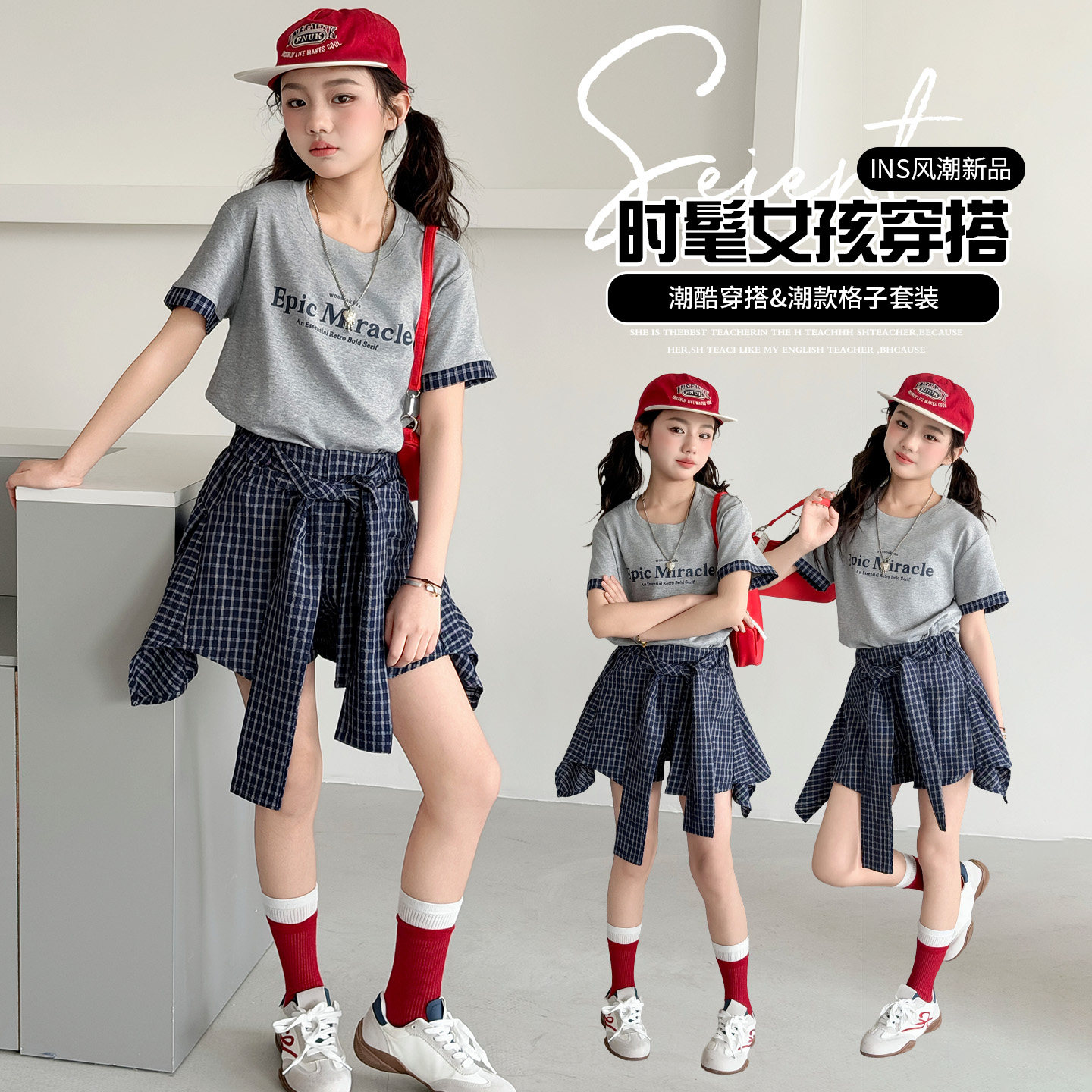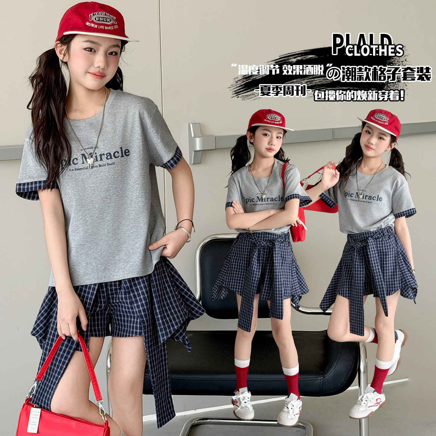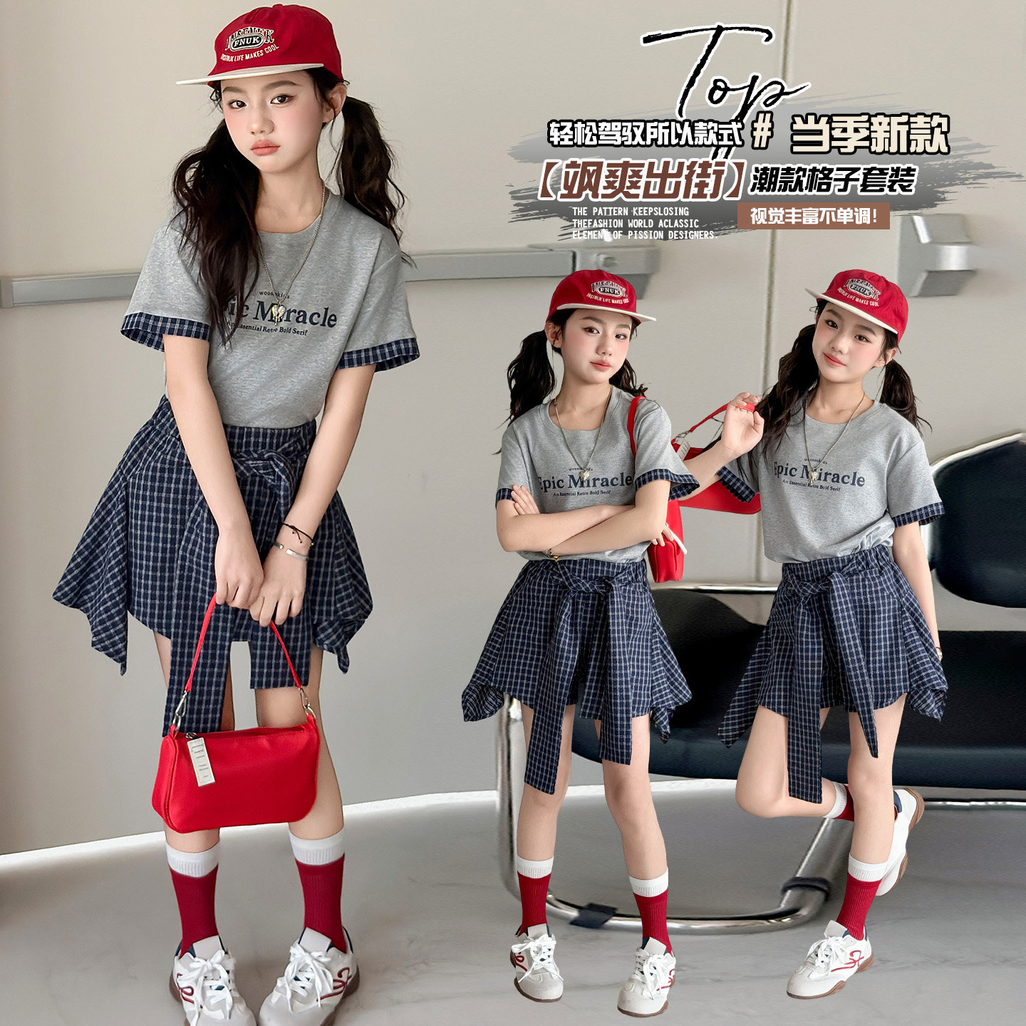 女童夏季格纹两件套韩范洋气T恤半身裙中大童时尚套装2026新款