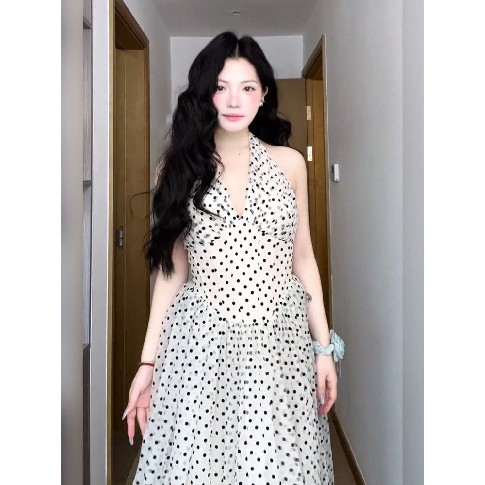 大码胖MM法式气质V领波点挂脖连衣裙夏季新款度假风绝美A字长裙子