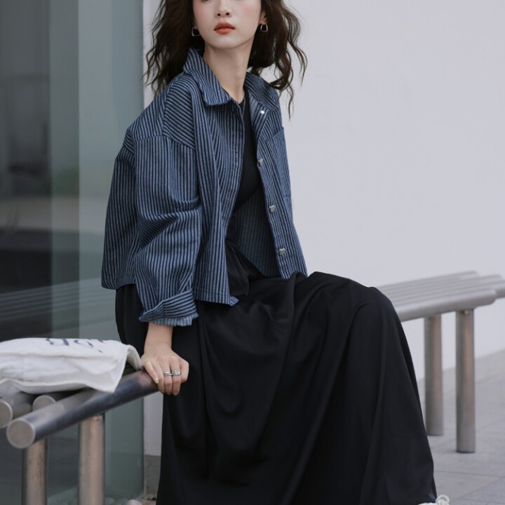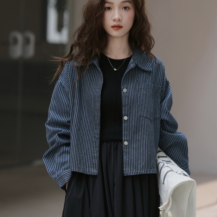 实拍2026年早春新款氛围感韩系通勤翻领条纹单排扣牛仔外套女装