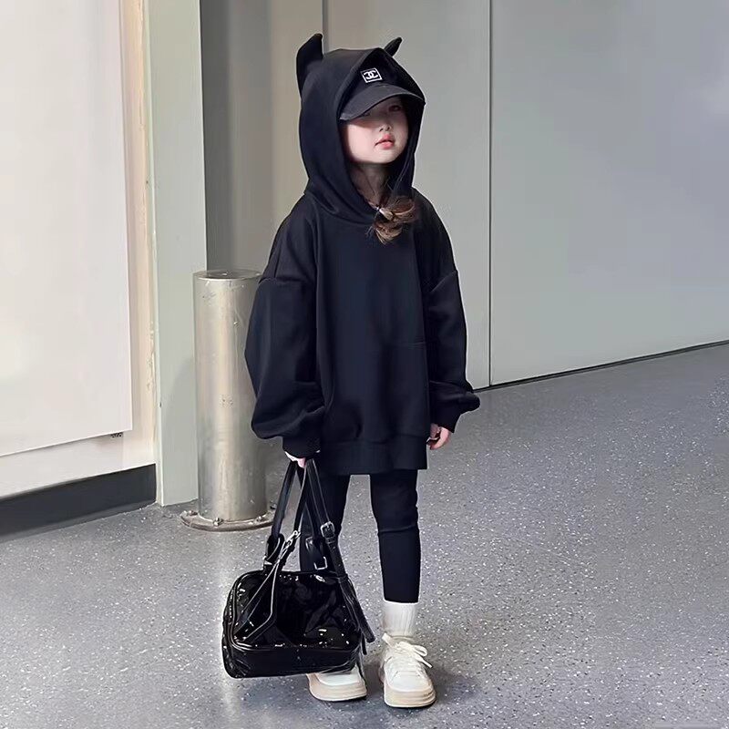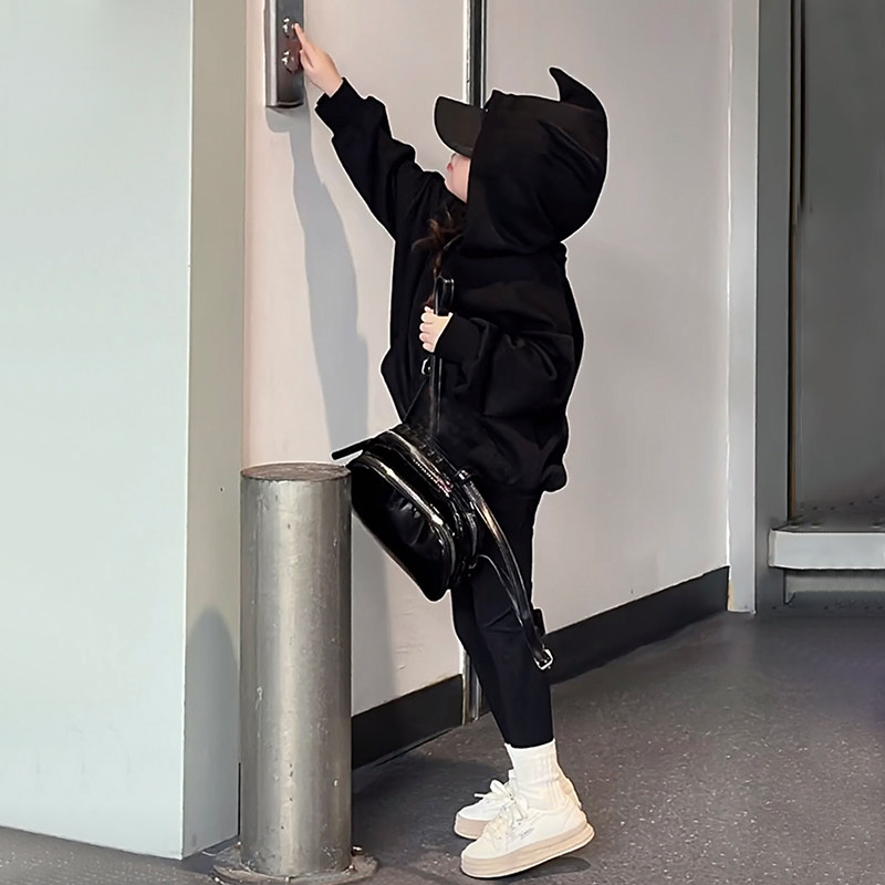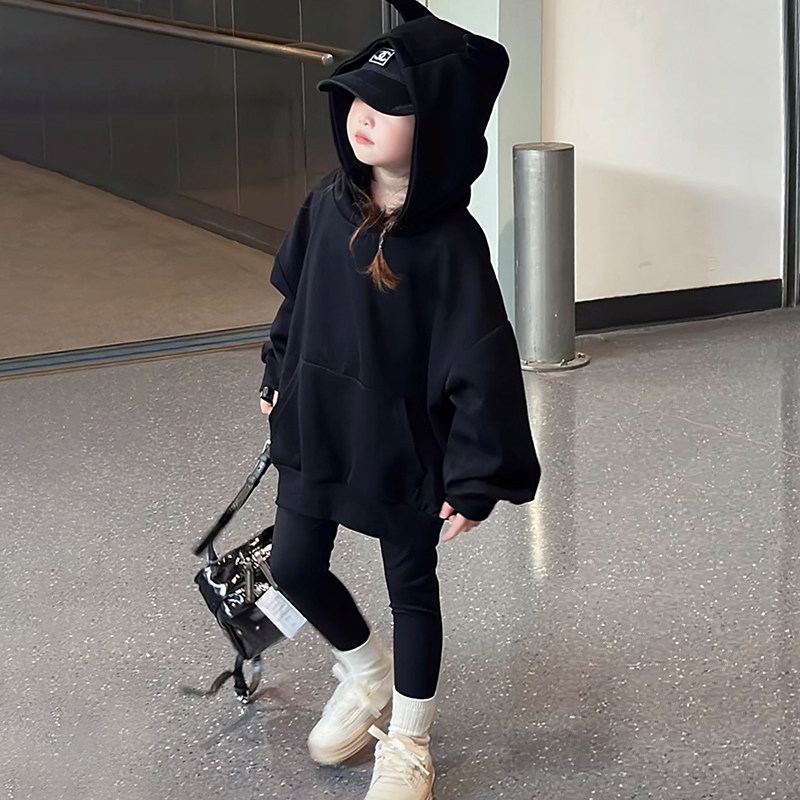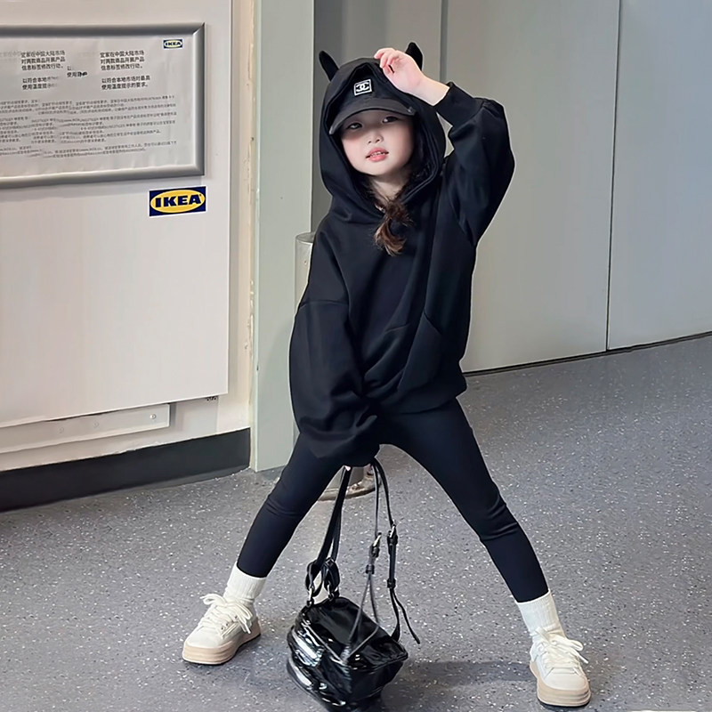 女童连帽卫衣秋冬加绒2026新款洋气儿童超好看衣服女大童黑色上衣