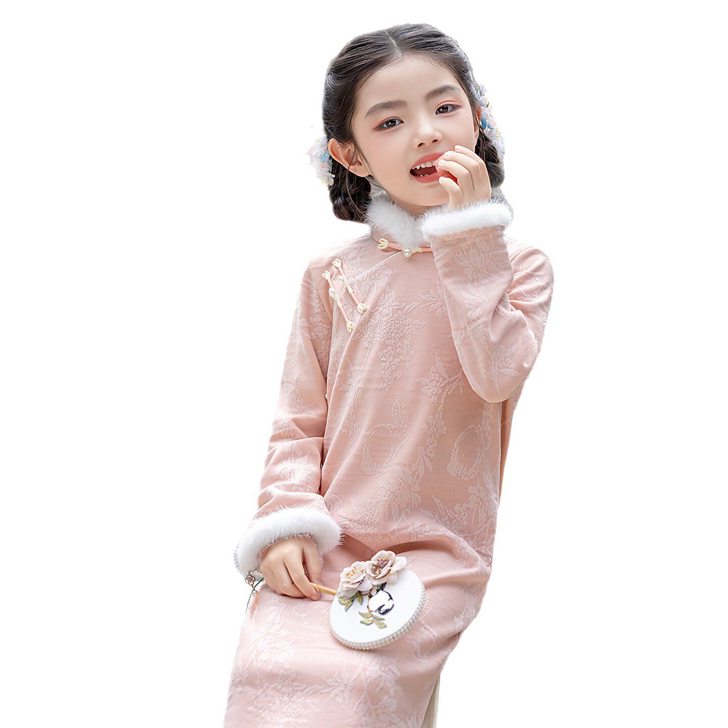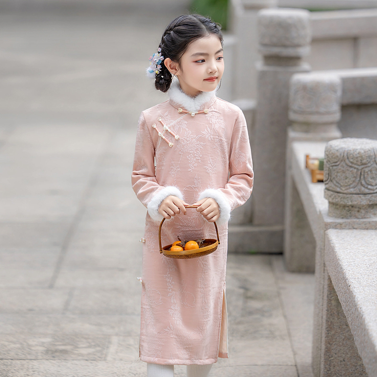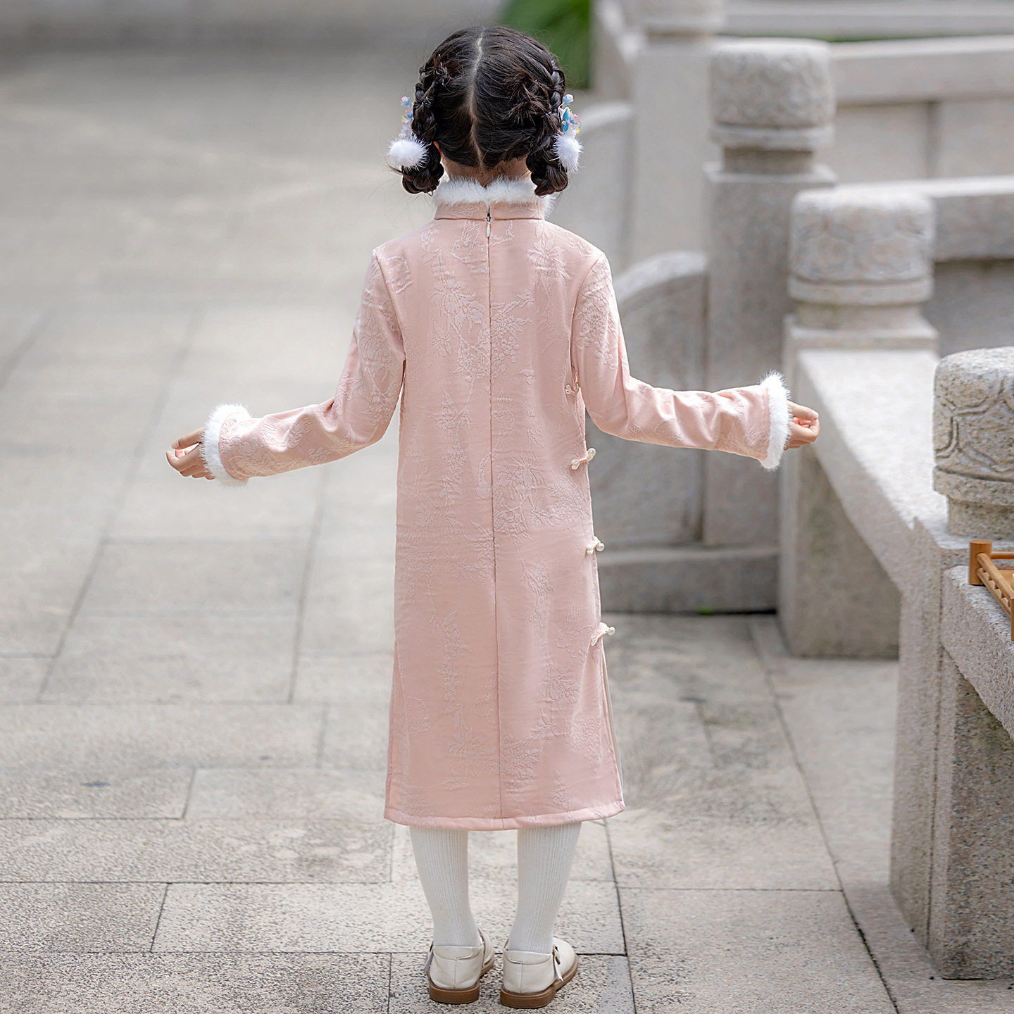 女童粉色旗袍裙子秋冬季儿童长袖中国风公主裙演出礼服连衣裙加绒