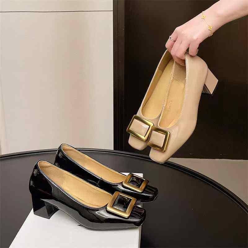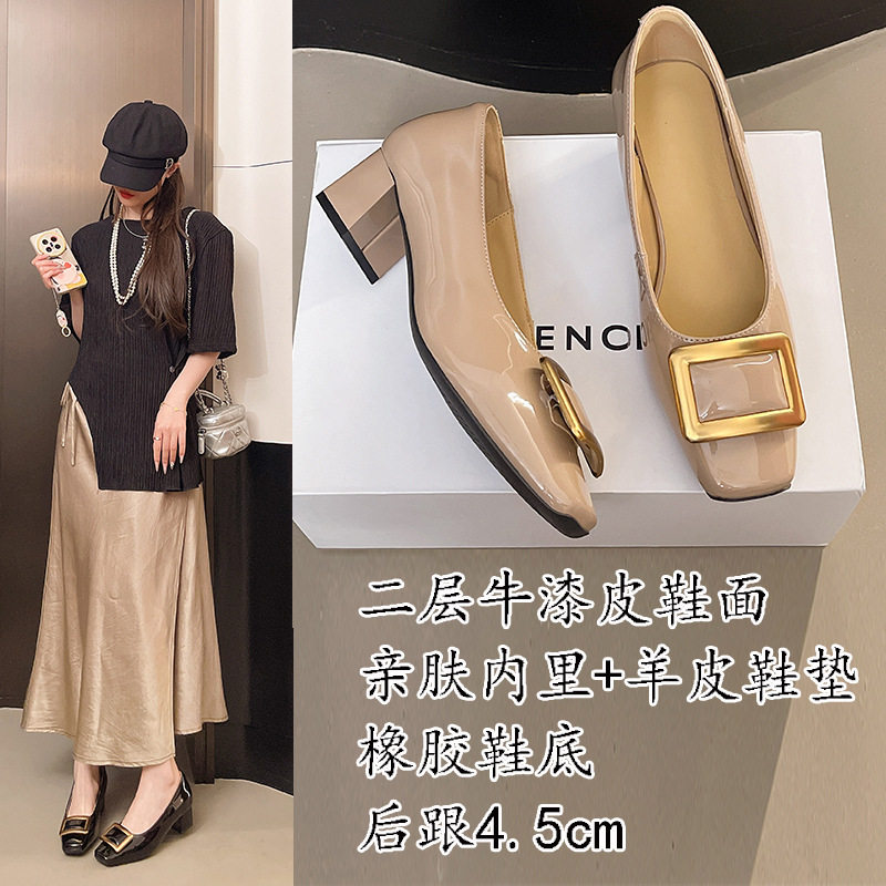 方头浅口单鞋女2025春夏新款方扣百搭粗跟中跟鞋软底舒适高跟鞋